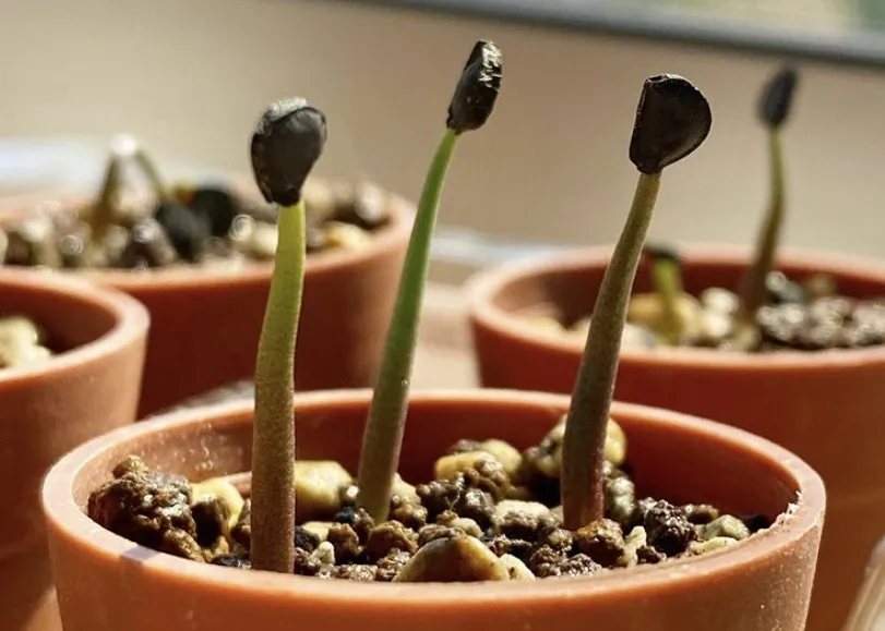 種を半日水に浸し、赤玉と日向土をブレンドした用土に播種。
