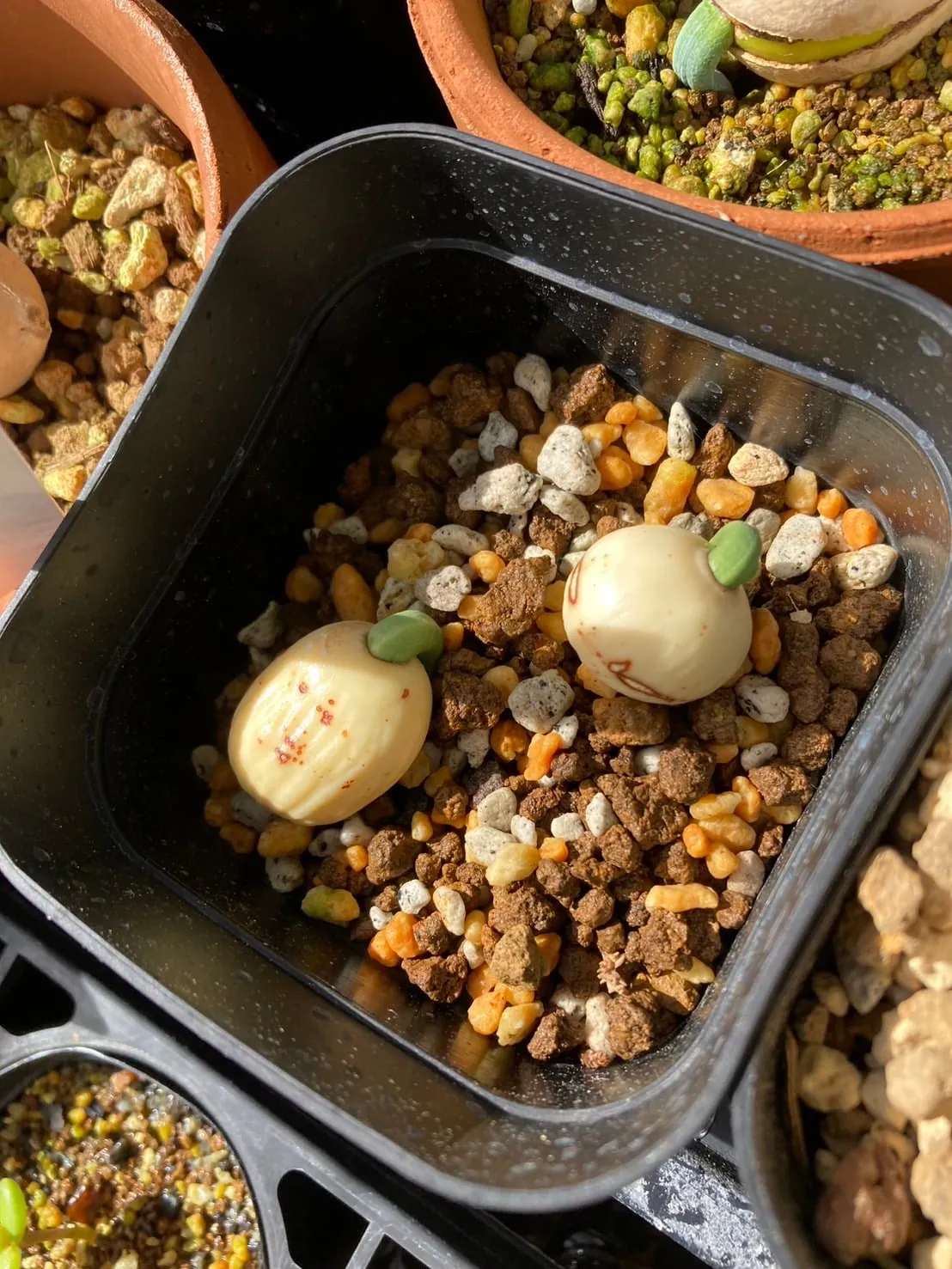 室温27℃前後。数日後4個発芽確認。残り2つのうち1つはすぐ腐敗、もう一つは2週間くらいに腐敗