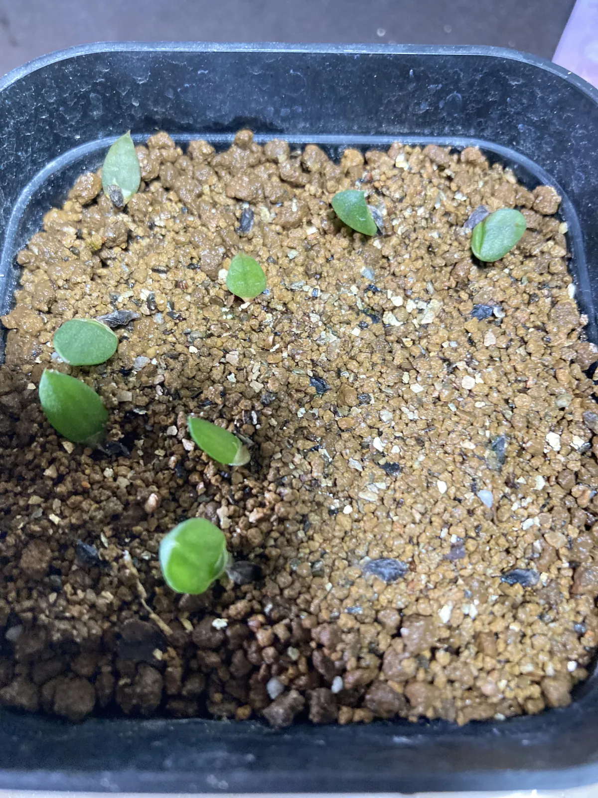 播種前に溶液などに浸けずそのままアロエ用土をふるった細かい用土に赤玉+バーミキュライトを敷き播種