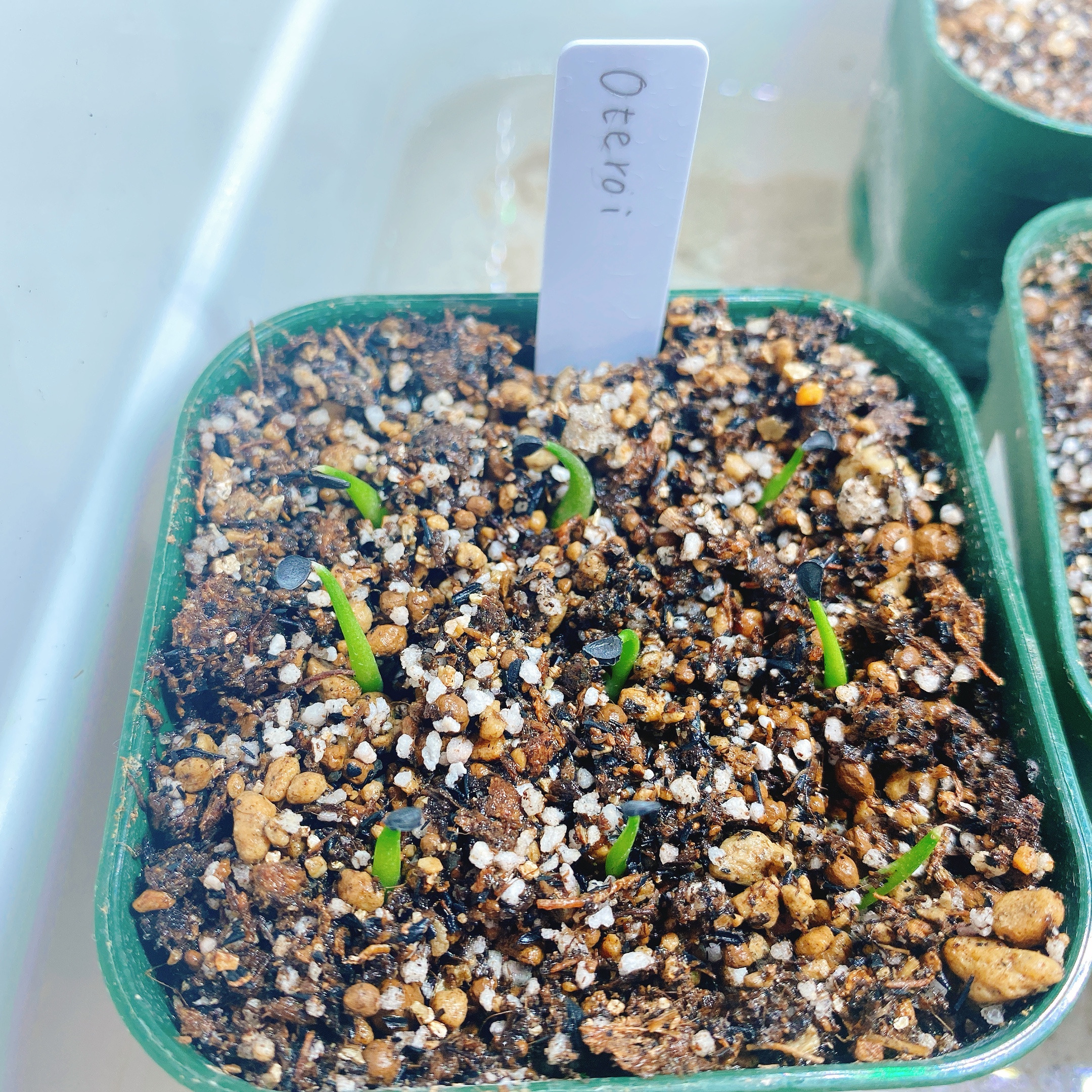 播種前にトップジンM(1000倍)、メネデール(100倍)液に12時間浸してます。