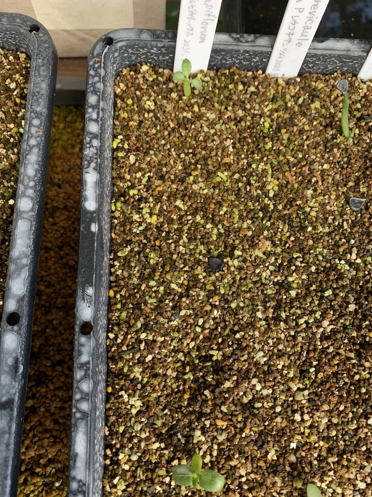 8/4播種。25〜30℃で管理し、1カ月後の発芽生存率16%(2/12)。
