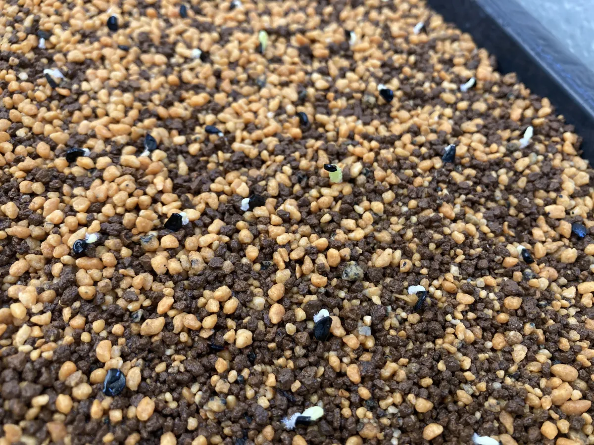 アガベ用土の上に鹿沼と赤玉の細粒を敷き詰め播種、衣装ケースで腰水中