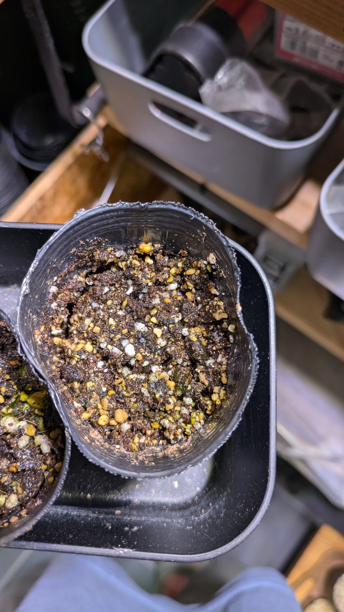 用土は下から軽石、赤玉土、市販の種まき用土の順