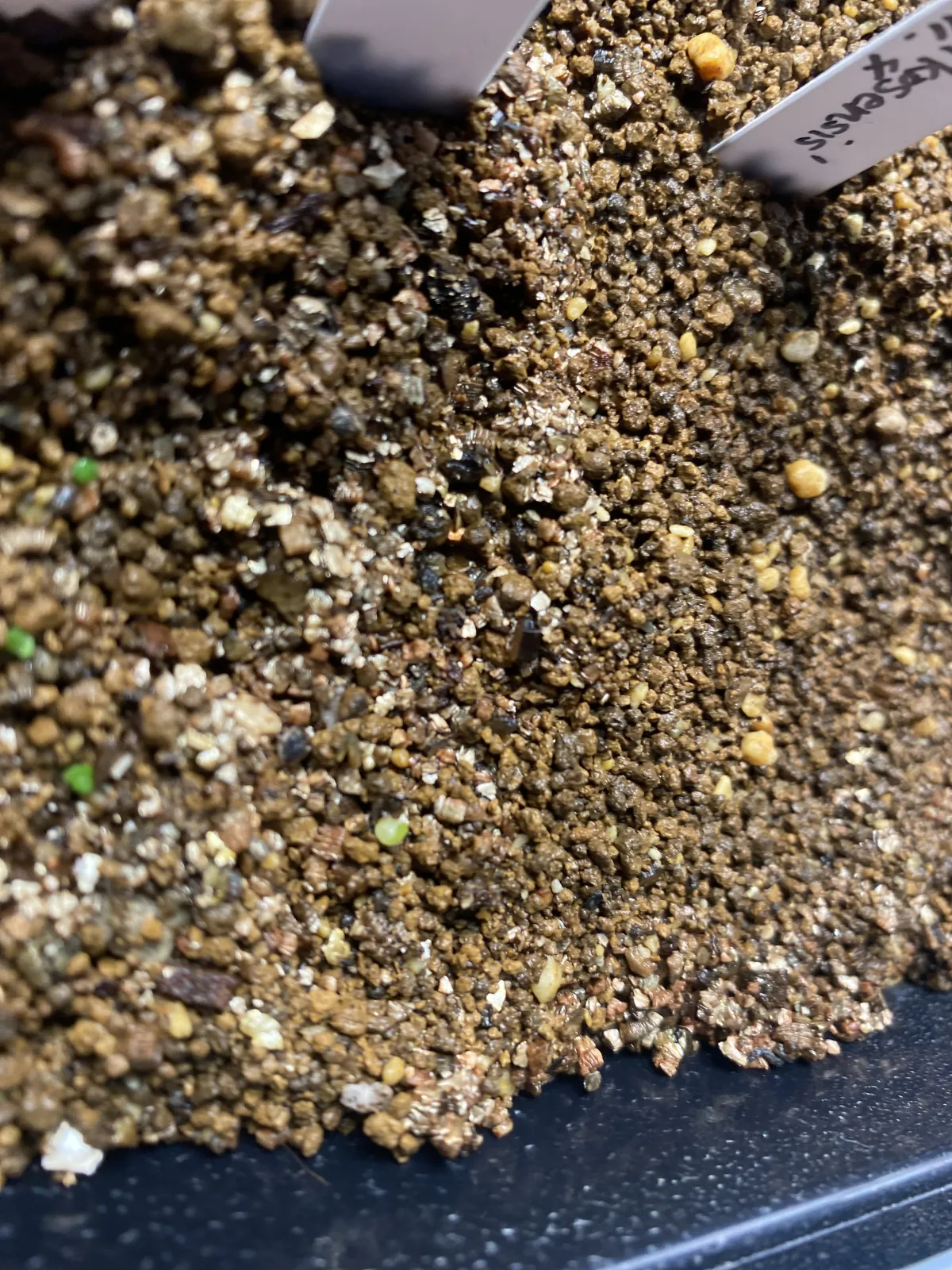 バーミキュラメインの用土に細目の盆栽の土を敷き播種、20度前後で管理