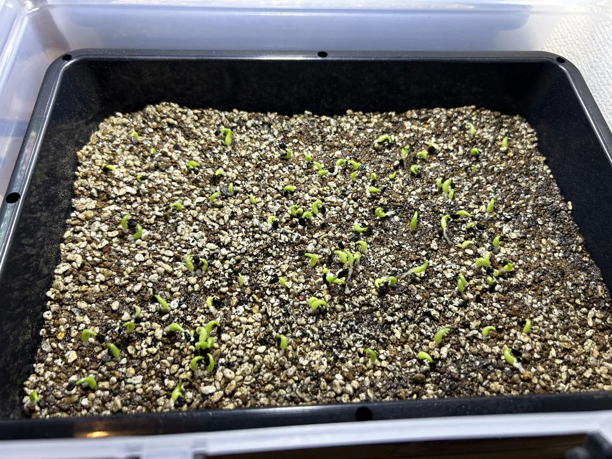 某ホームセンターのアガベの土を敷き播種、15度〜25度、腰水で管理