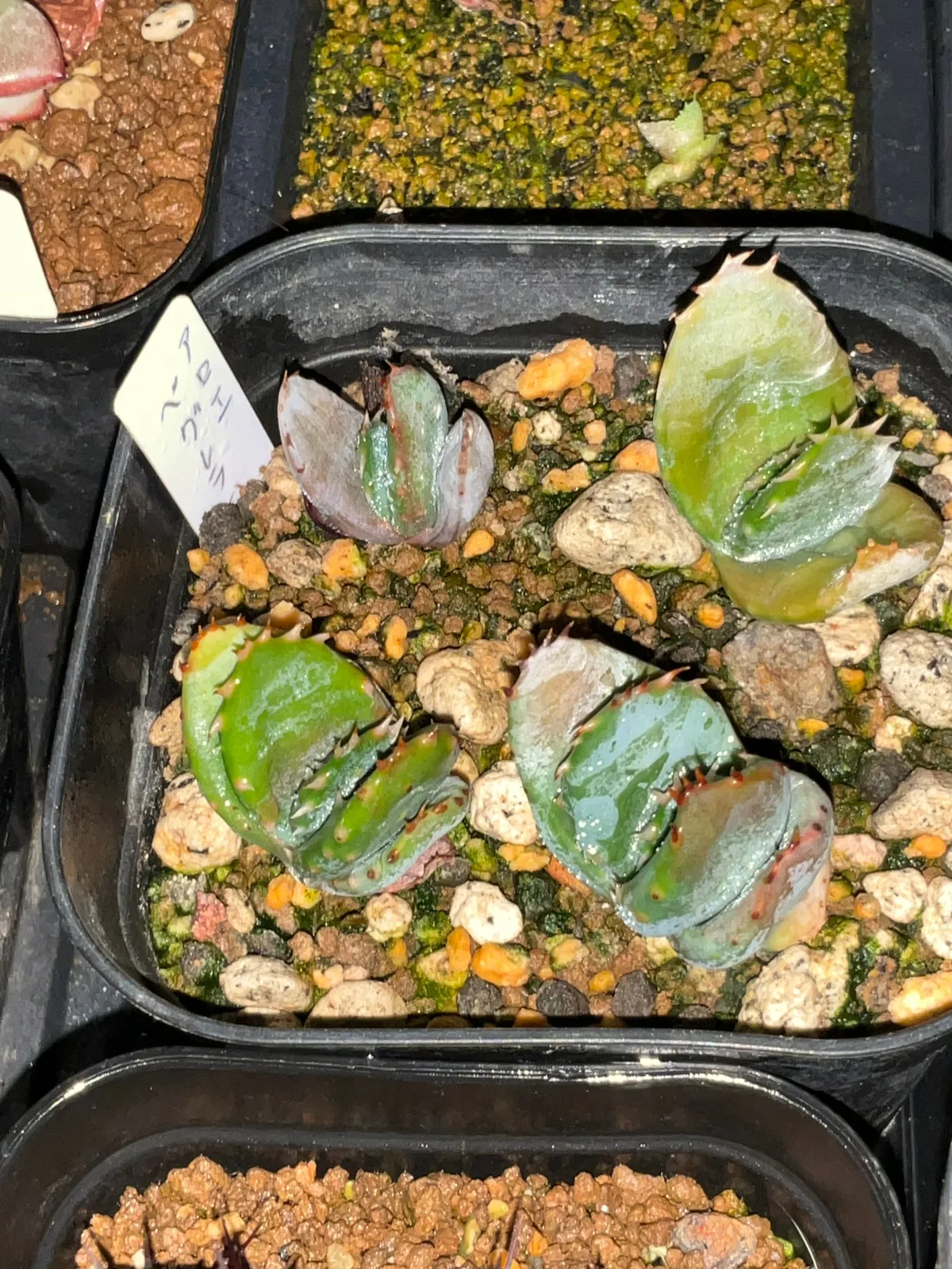 土は赤玉小粒のふるいにかけた微粉、発芽後は蓋を外して管理。