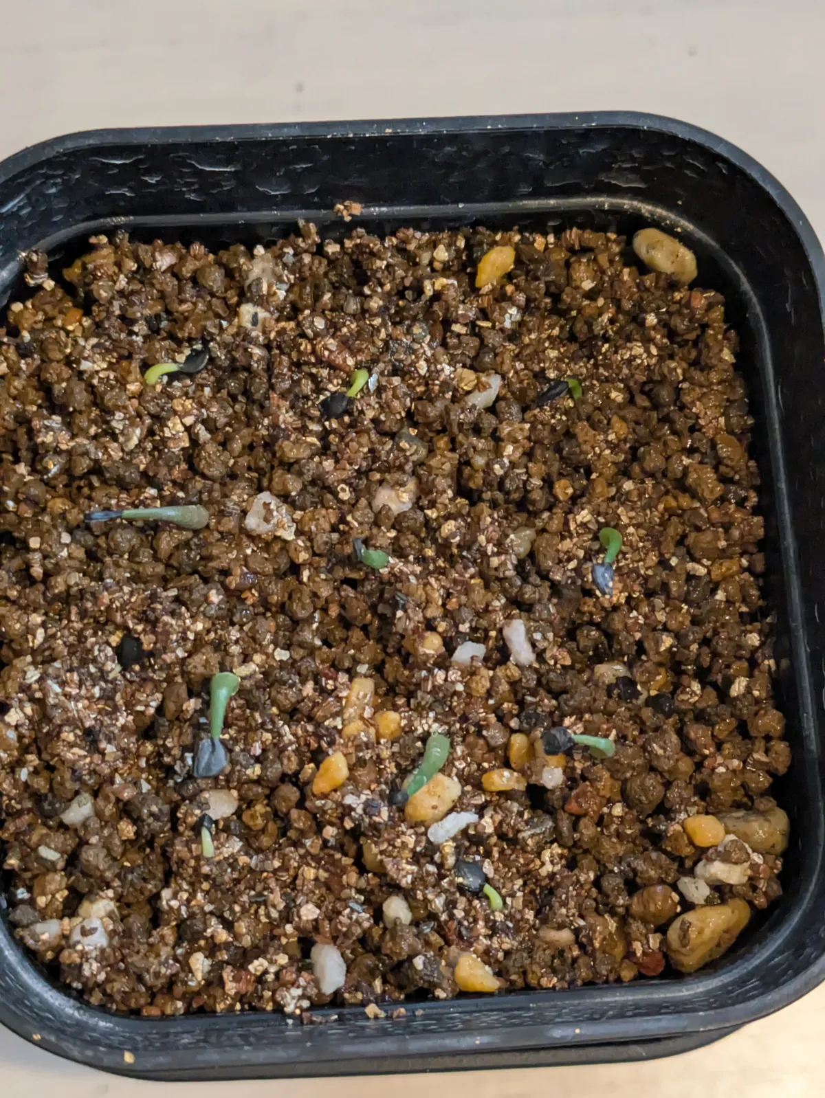 ・プラカップにバーミキュライトを敷き、メネデールで湿潤させたところに播種。フタをして管理。発根したものから用土をいれたプレステラ90へ順次移動(バーミキュライトごとすくって移植)