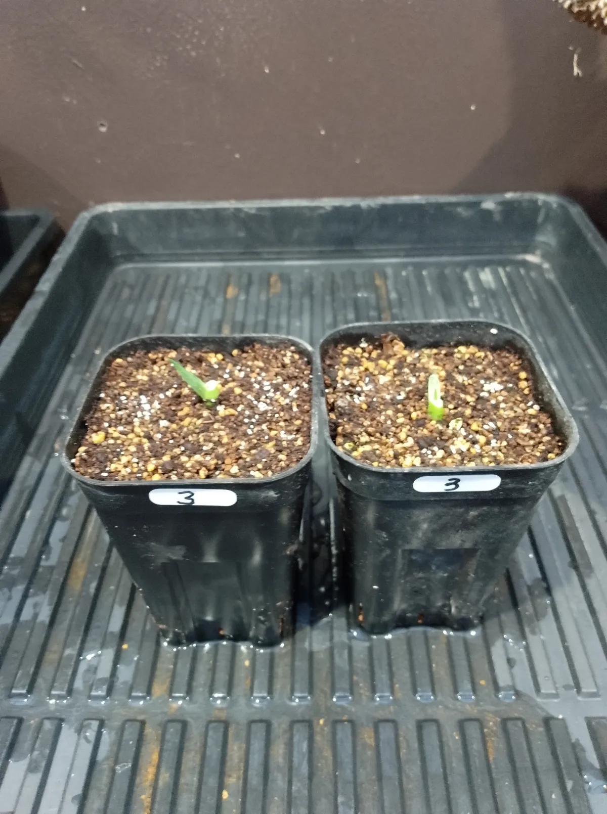 [ 播種日 / 撮影日 ] 2024/11/14播種 2025/2/2撮影 [ 播種数 / 発芽数 ] 22粒/10粒 [ その他(用土や管理方法など)] 播種前にダコニール+メネデール溶液に半日程度浸漬 赤玉土と鹿沼土ブレンド用土に播種 25度〜30度で管理 発芽率は50%だったが、その後の成長があまり良くなく。 現在残っているのは2株。