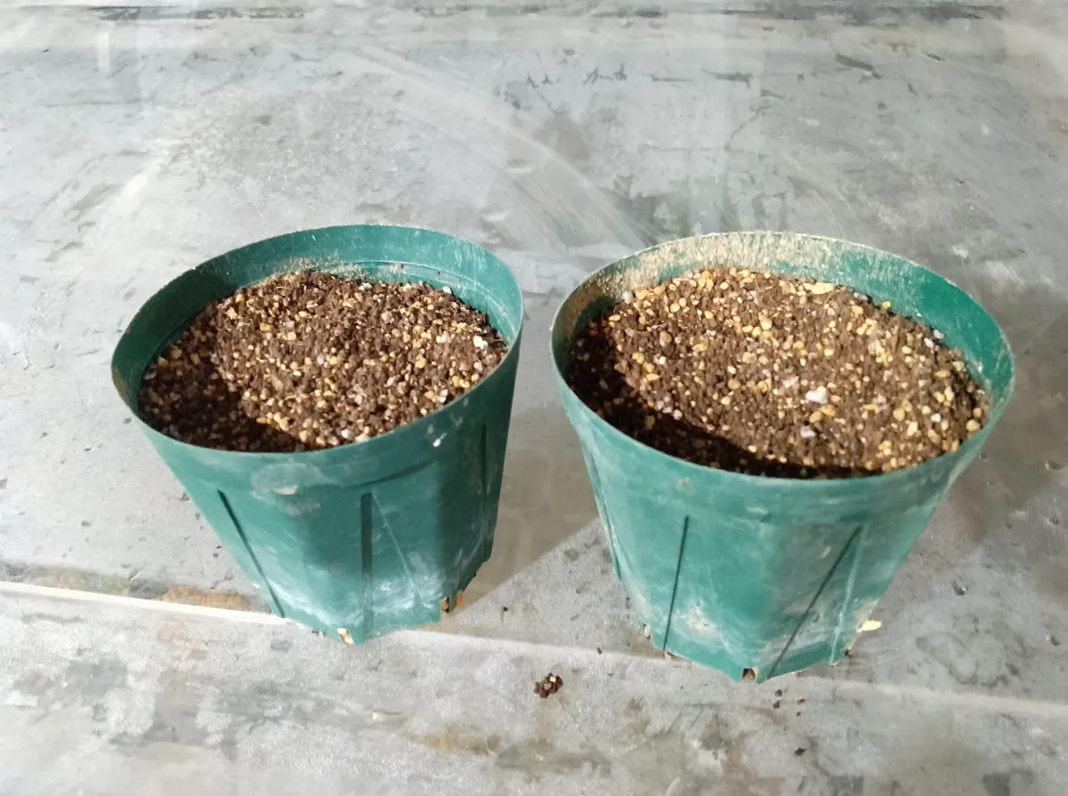 [ 播種日 / 撮影日 ] 2024/11/14播種 2025/2/2撮影 [ 播種数 / 発芽数 ] 22粒/15粒 [ その他(用土や管理方法など)] 播種前にダコニール+メネデール溶液に半日程度浸漬 赤玉土と鹿沼土ブレンド用土に播種 25度〜30度で管理 発芽率は70%とまあまあ良かったが、その後の茎が細く倒れてしまいすべて枯れてしまった。