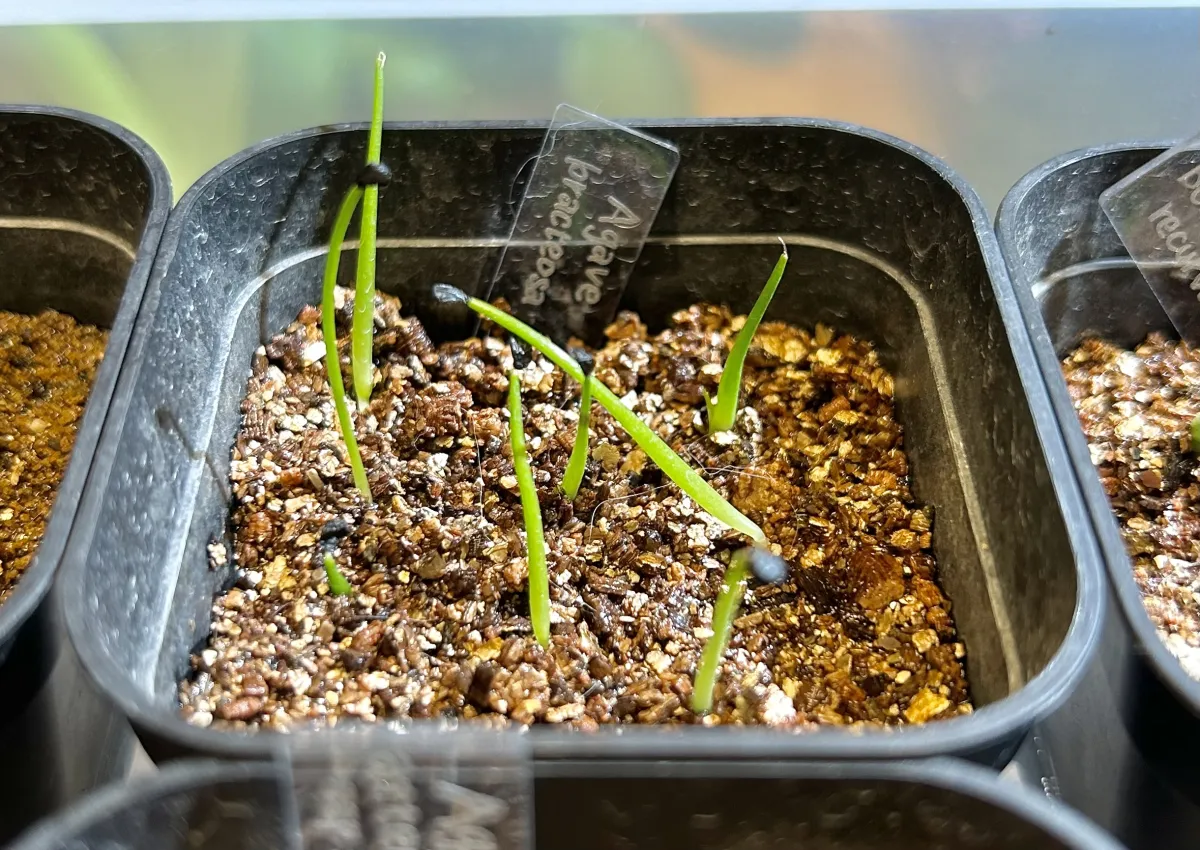 赤玉メインの用土にバーミキュライトを敷き播種、ヒーターマット上、密封タッパーでダコニール+メネデール液腰水管理中