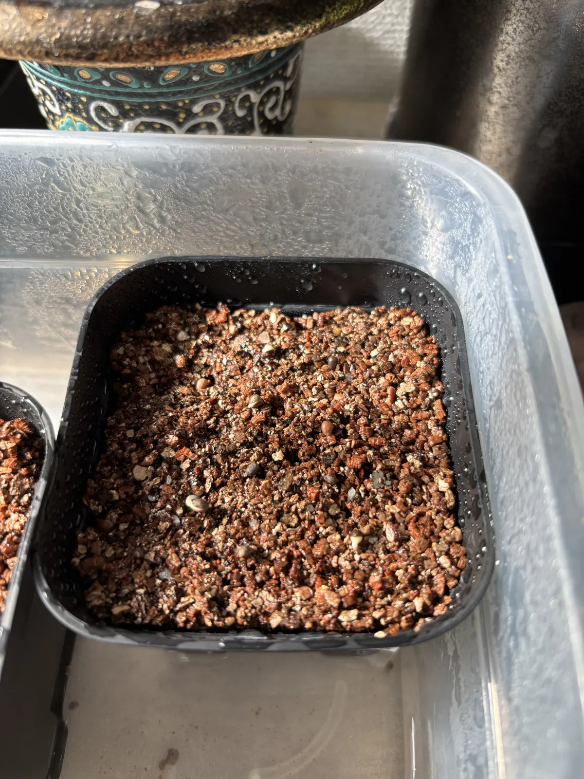 小粒の赤玉、軽石1:1の用土に細目のバーミキュライトを敷き播種。