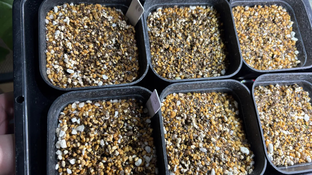 鉢底に日向土、メインに多肉植物用の播種用土を使用し播種、腰水管理で毎朝晩霧吹きをし、約20度管理