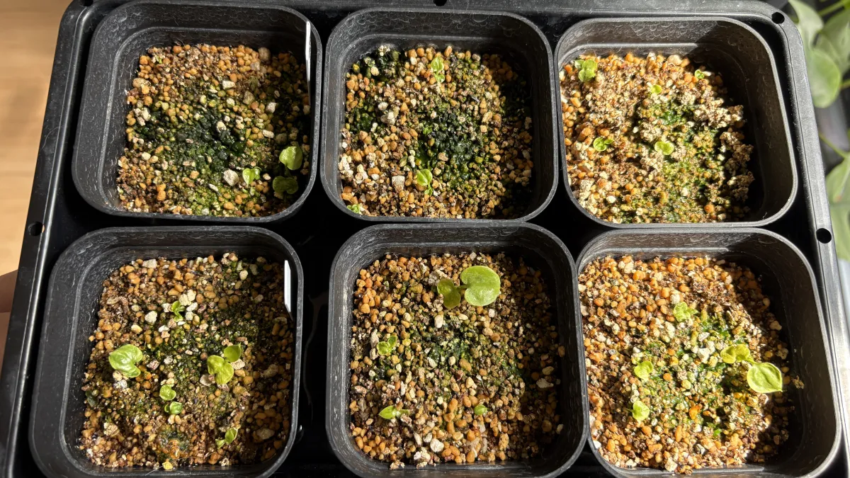 鉢底に日向土、メインに多肉植物用の播種用土を使用し播種、腰水管理で毎朝晩霧吹きをし、約20度管理
