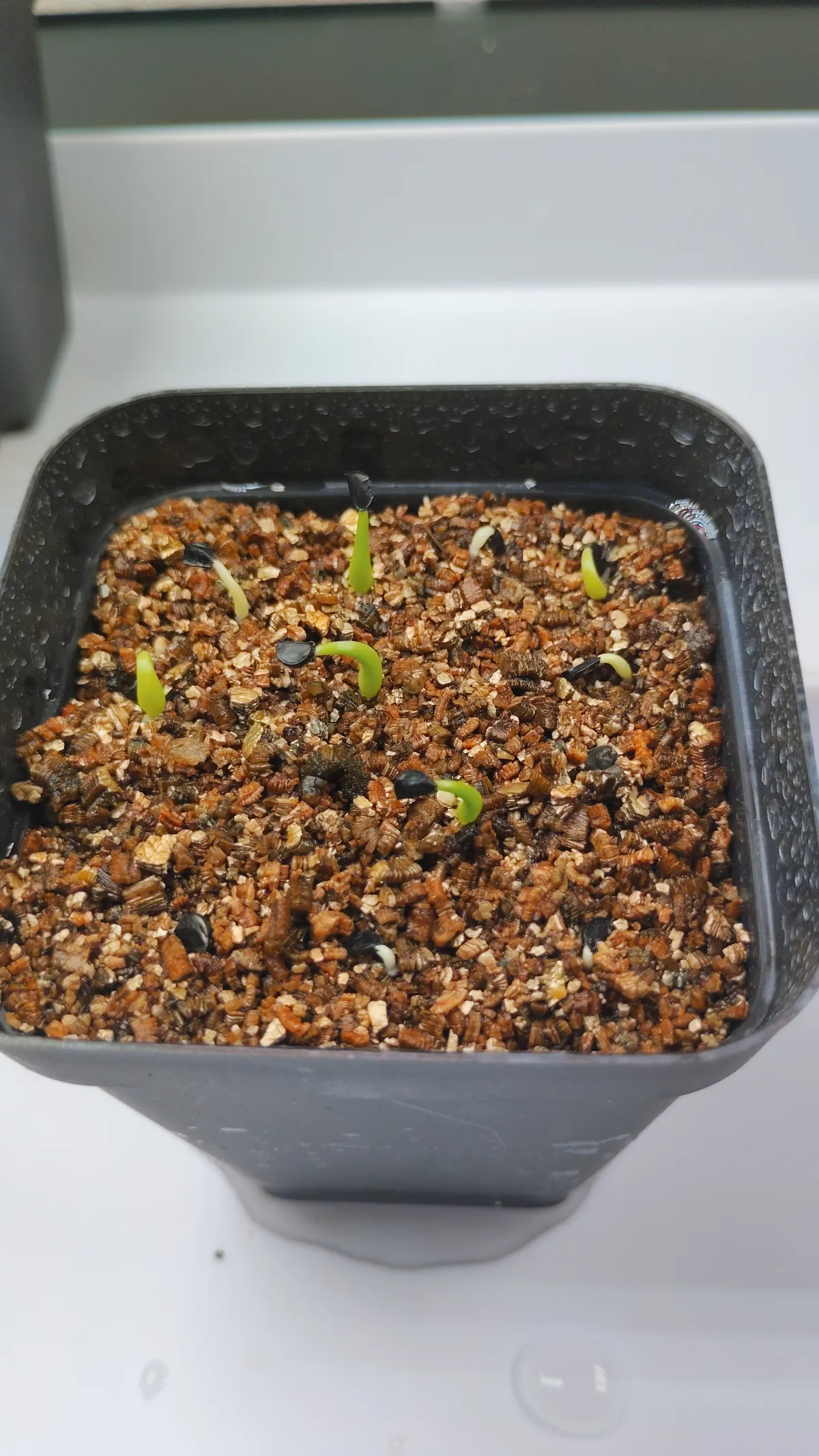 播種後はトレーで腰水、ラップで保湿&保温、1日1~2回ベンレート+メネデール溶液を霧吹きで与える