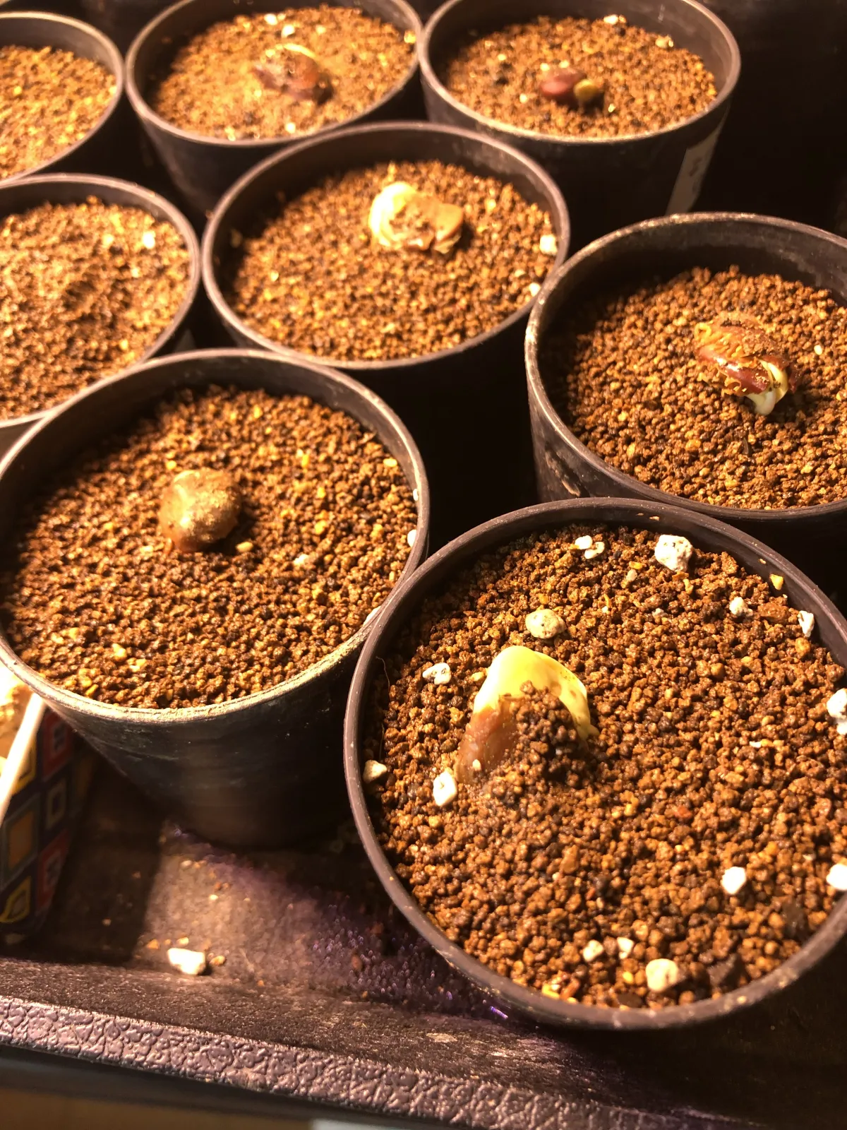 胚を傷つけつけないように殻の反対側を傷つけて中身を露出させ、ベンレートとメネデールを入れた水に24時間浸水。赤玉細粒を入れた鉢(腰水)に種を置いてラップで保湿し室内保管。