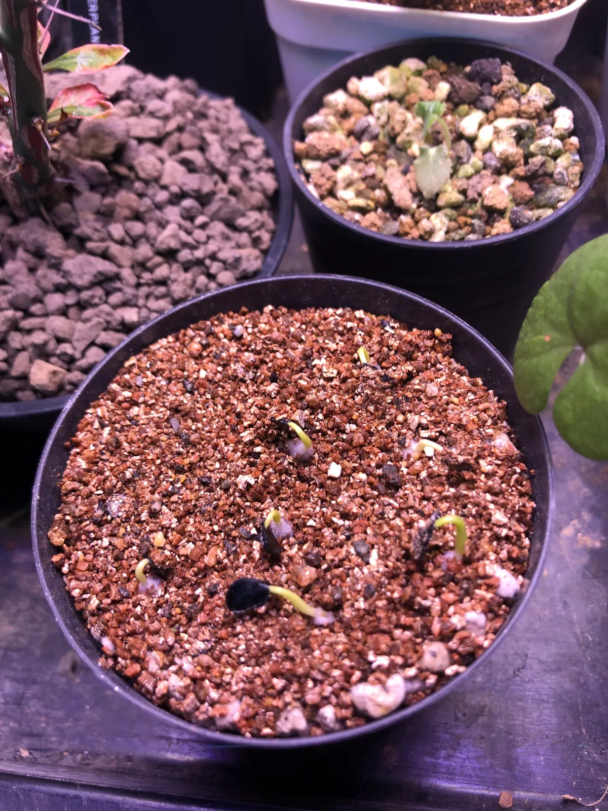 ベンレートとメネデールを入れた水で、赤玉細粒を入れた鉢を腰水して、種を置いてタッパーで保湿し室内保管。