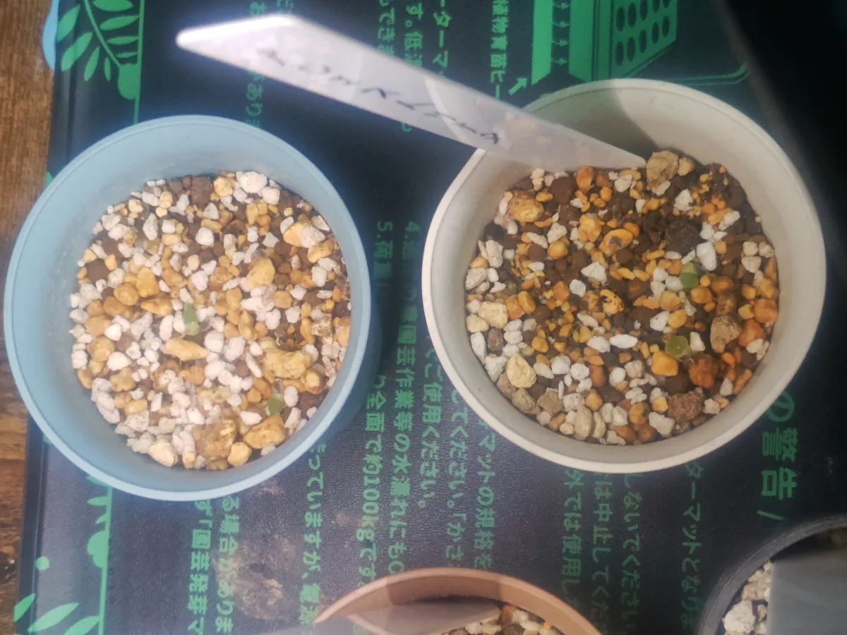 播種前にダコニール+メネデール溶液に1.5日程度浸漬後、多肉用の土の上にのせ、