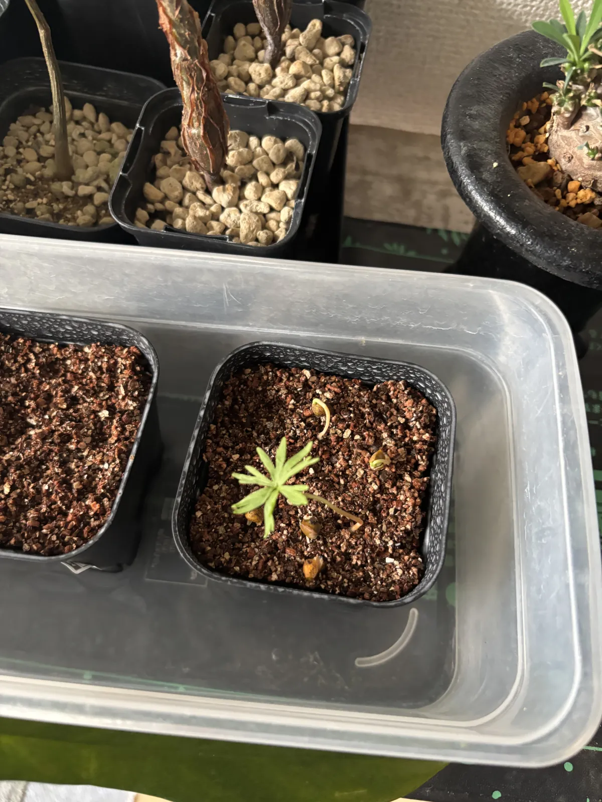 小粒の赤玉、軽石1:1の用土に細目のバーミキュライトを敷き播種。