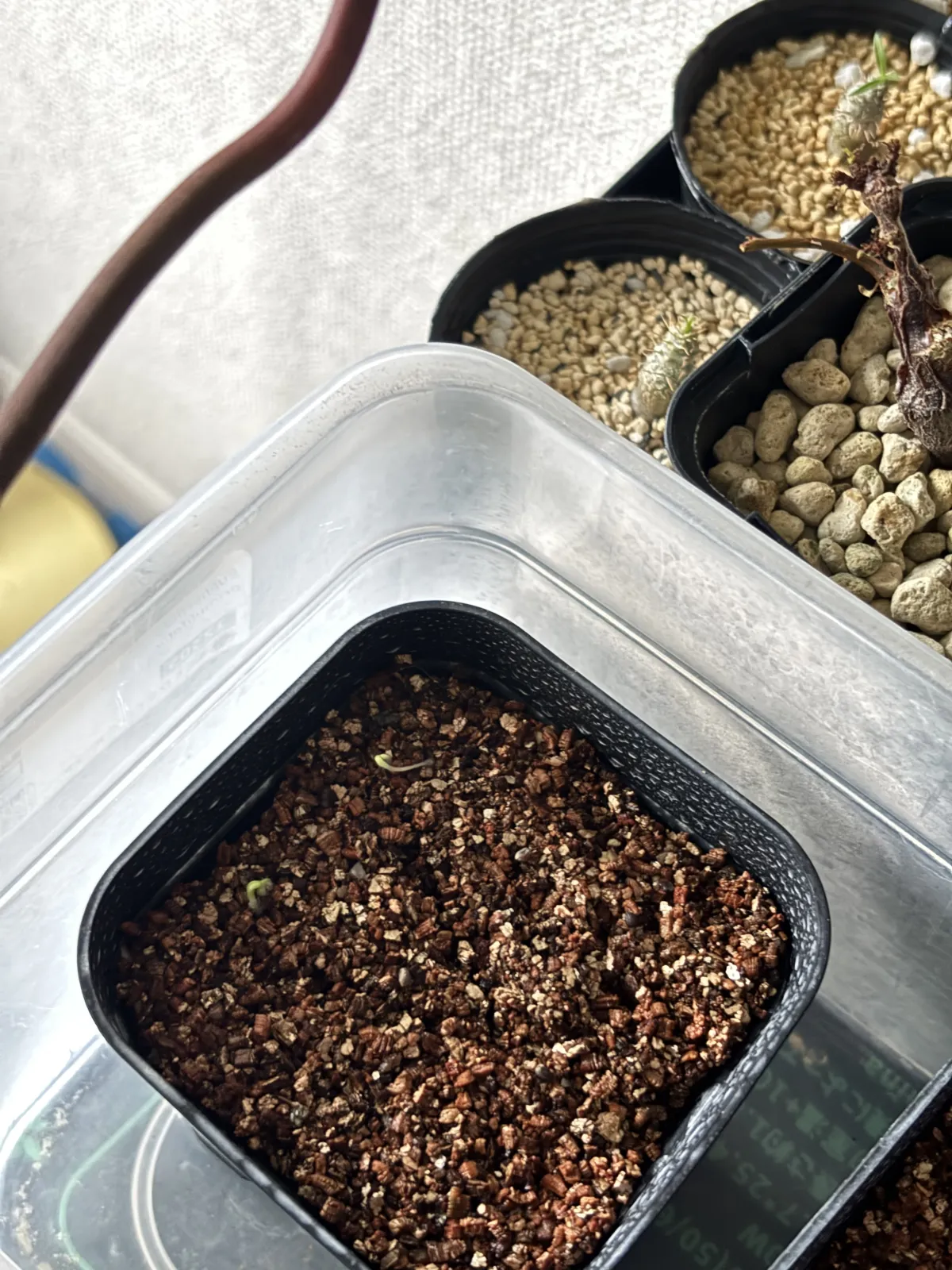 小粒の赤玉、軽石1:1の用土に細目のバーミキュライトを敷き播種。