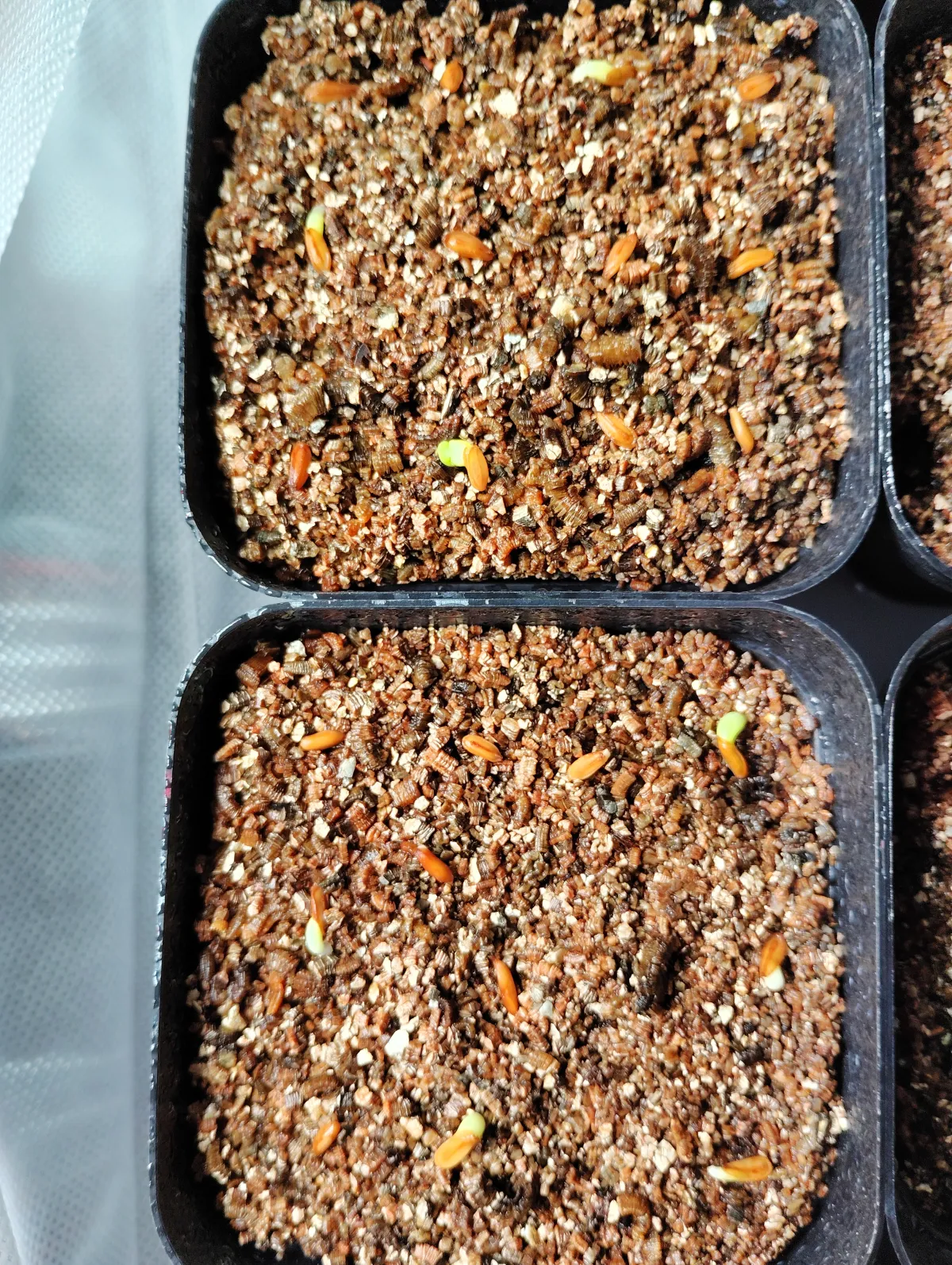 - 25度前後で腰水、ラップしLED照射 赤玉1:バーミキュライト1の用土、表面1~2cmくらいはバーミキュライトのみ 14時間ほどメネデール+ベンレート溶液に漬けてから播種