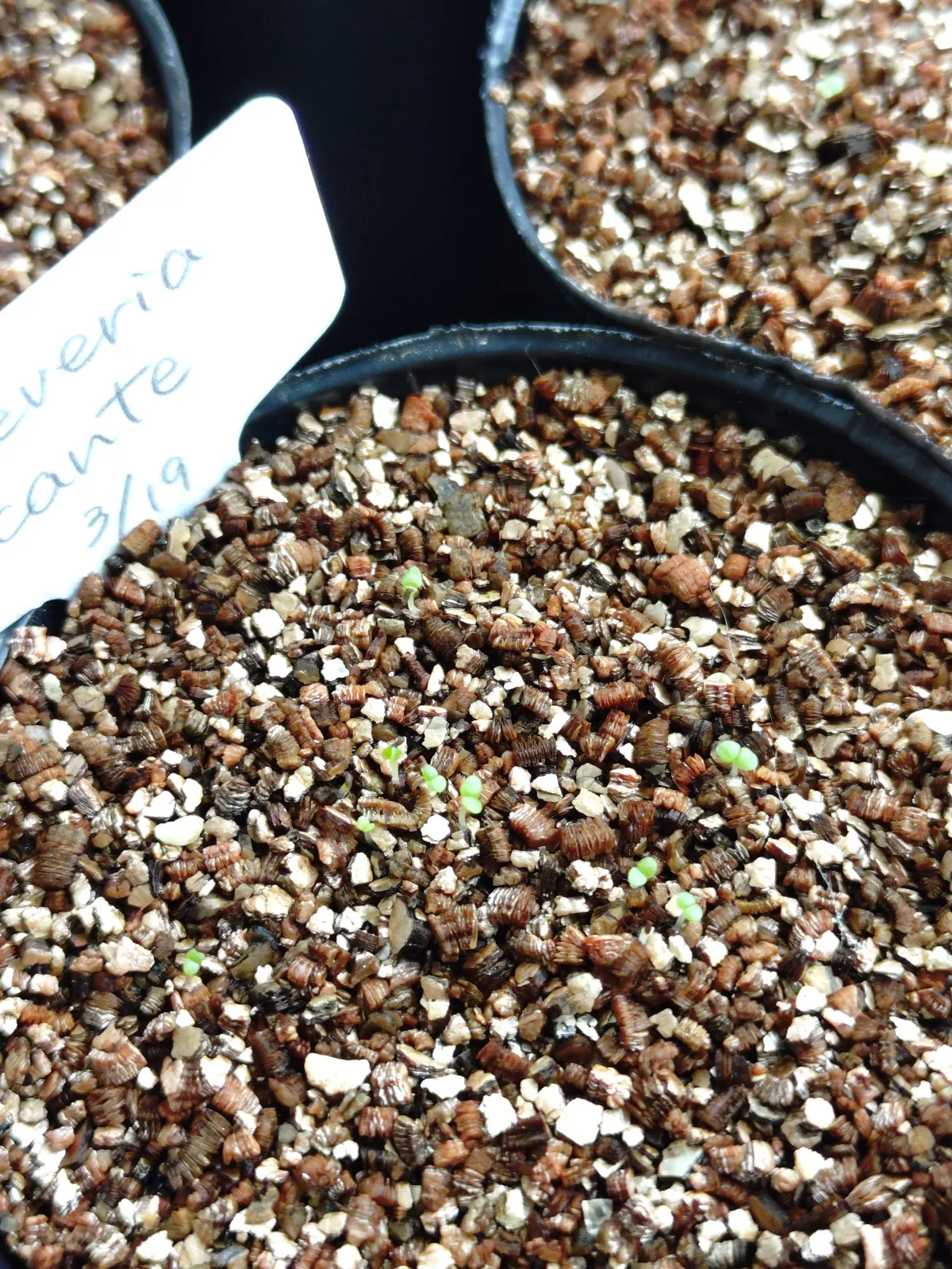 軽石細粒、鹿沼土細粒、ピートモス、バーミキュライトの混合土にバーミキュライトを敷き詰めて播種