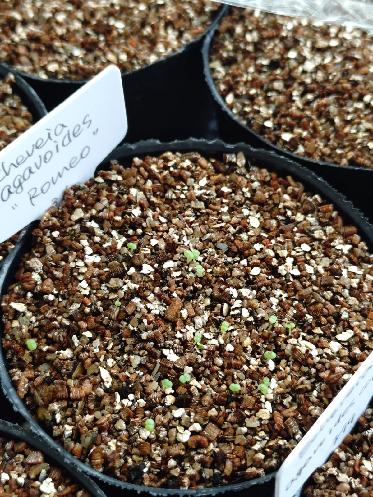 軽石細粒、鹿沼土細粒、ピートモス、バーミキュライトの混合土にバーミキュライトを敷き詰めて播種