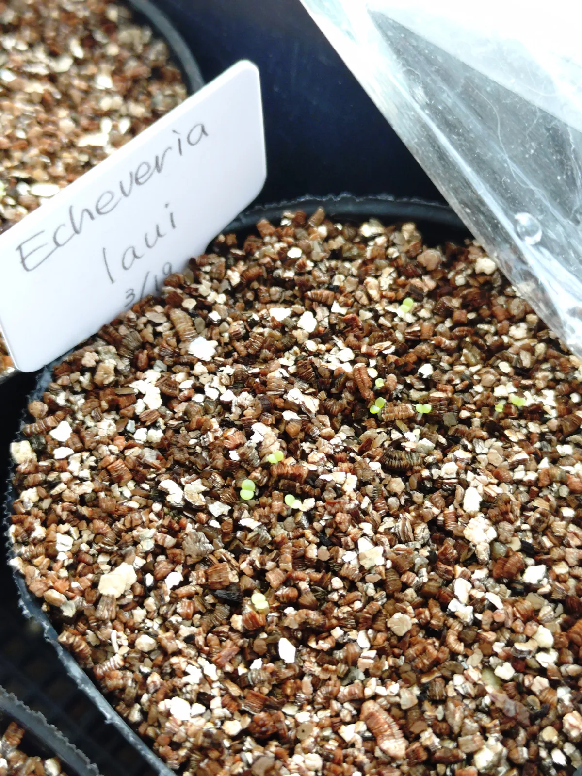 軽石細粒、鹿沼土細粒、ピートモス、バーミキュライトの混合土にバーミキュライトを敷き詰めて播種