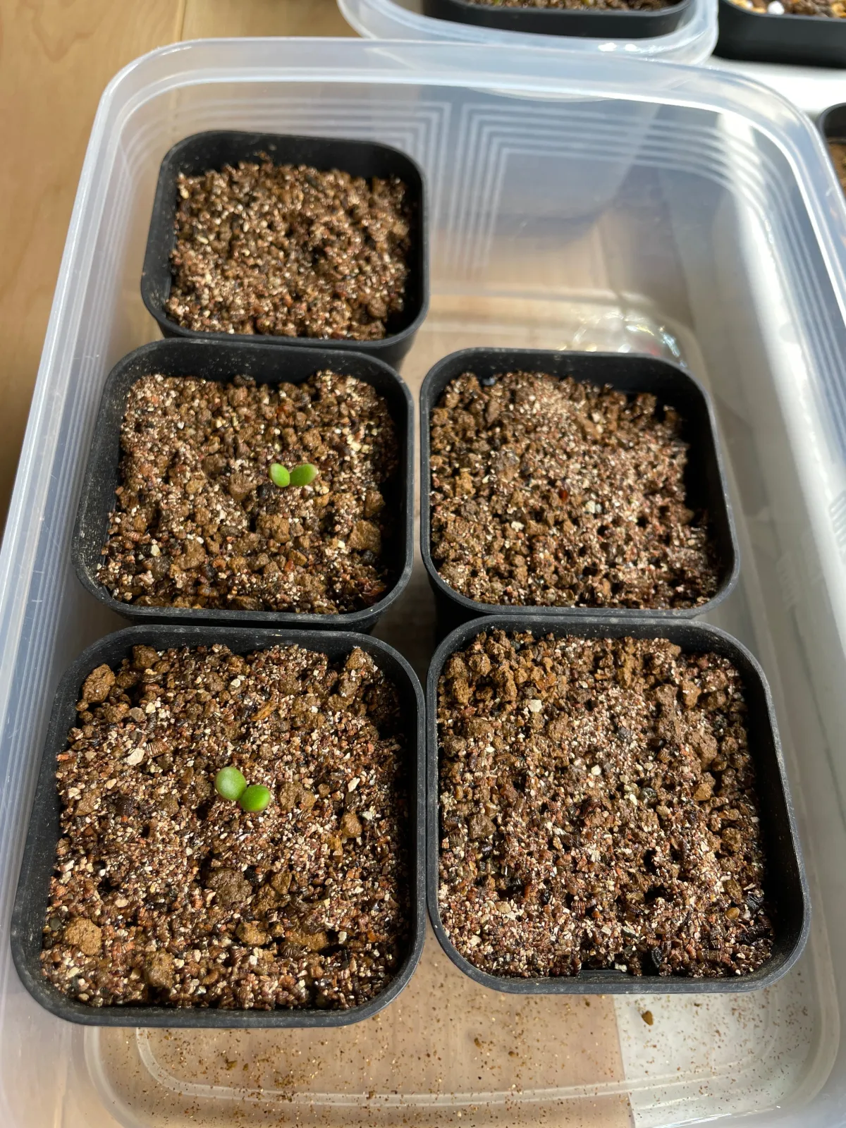 赤玉メインの用土にバーミキュライトを敷き尖った方が下になるように播種。室内20度、窓際で管理。5日程度で発芽。