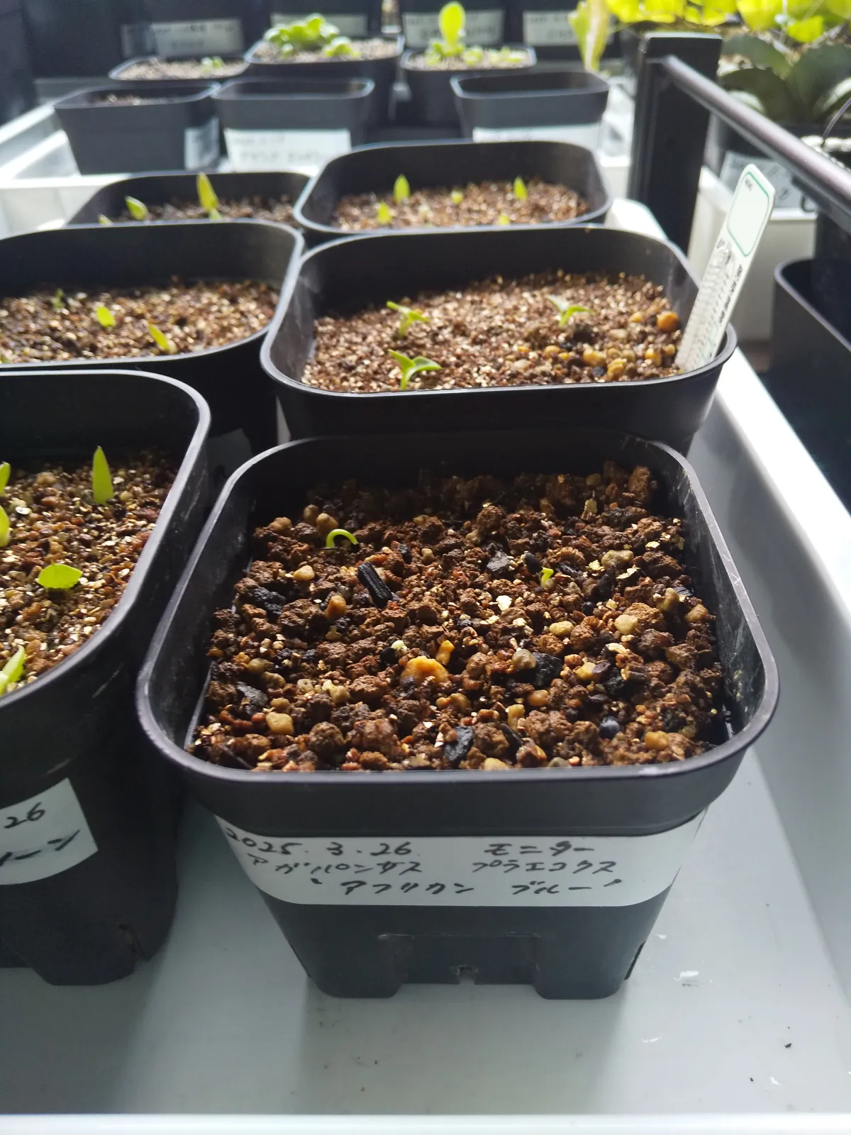 赤玉メインの用土に細目のバーミキュライトを敷き播種、20度〜25度で管理