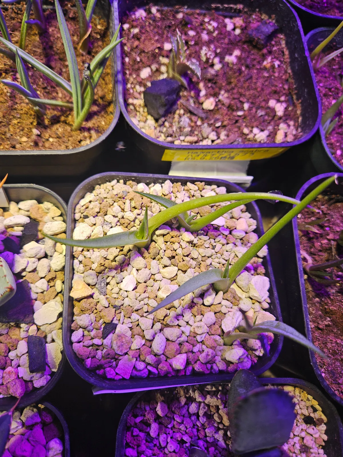 発芽までプレステラをタッパーに入れ、蓋を閉めて室内にて腰水管理。ある程度発芽したら蓋を外して腰水。現在は乾いたら水やり。たまに液肥+活力剤