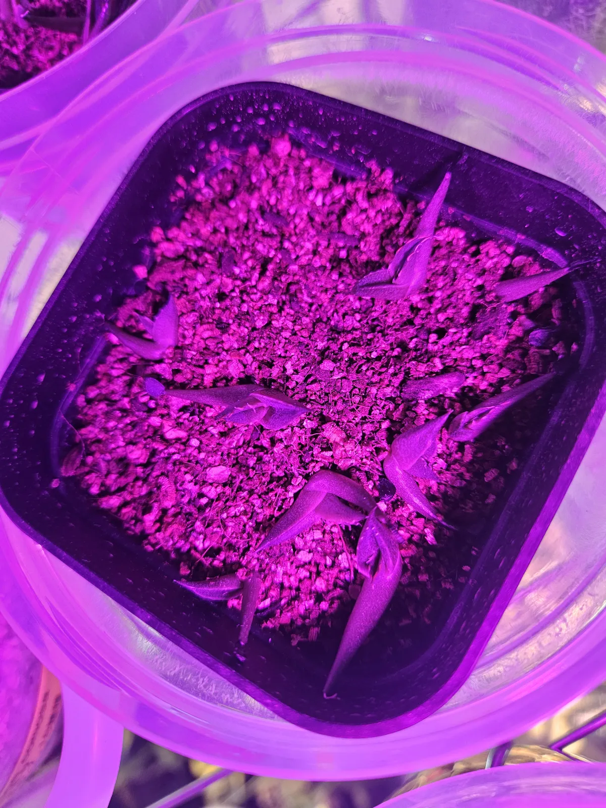 発芽までプレステラをタッパーに入れ、蓋を閉めて室内にて腰水管理。ある程度発芽したら蓋を外して腰水。現在は乾いたら水やり。たまに液肥+活力剤