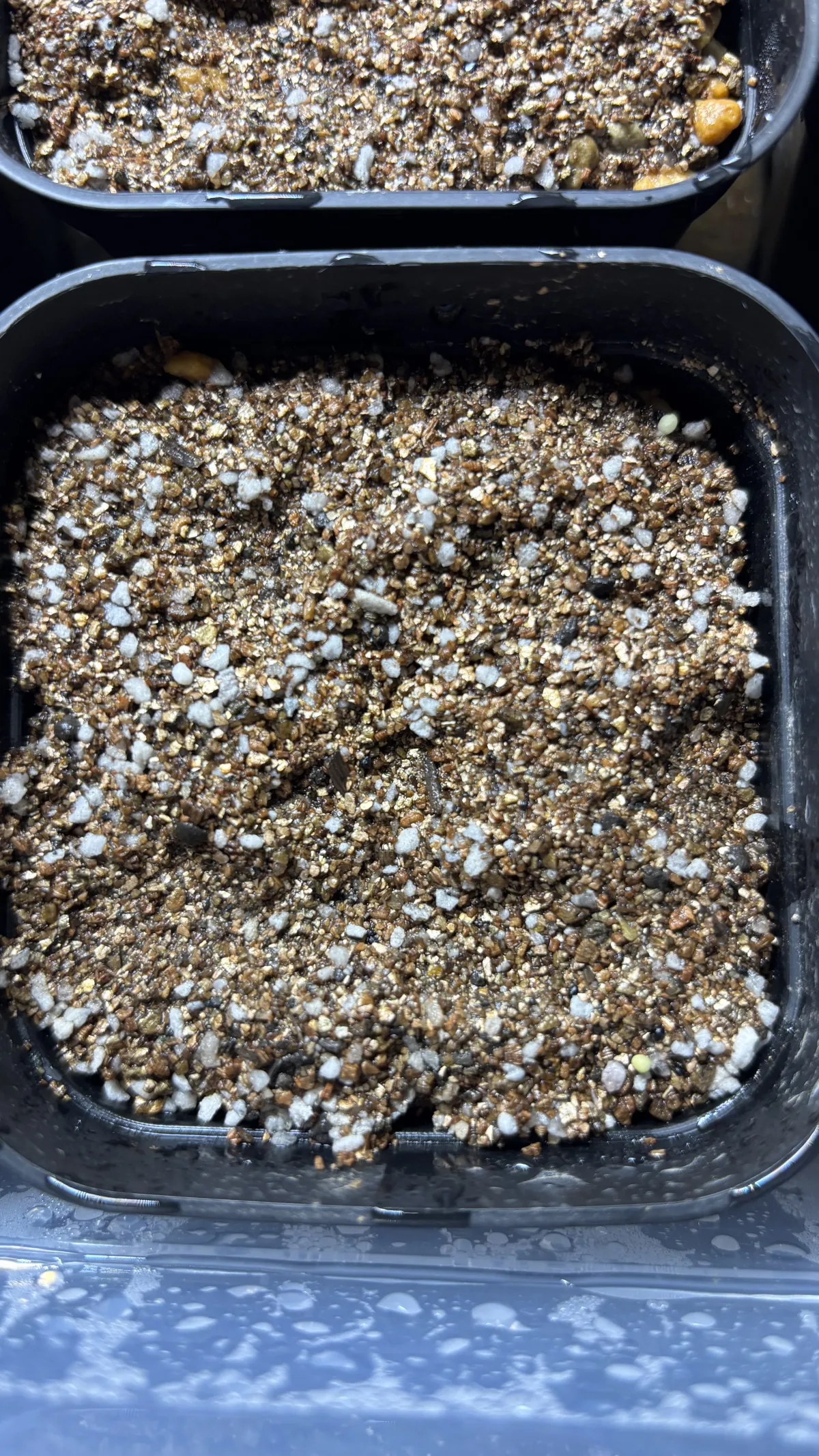用土(表面は赤玉土極細粒,中底面は一般的な多肉用土)に種を蒔き、半透明の蓋をして腰水管理をしました。