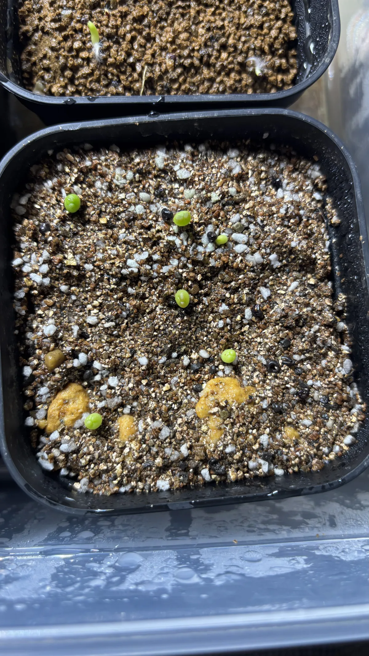 用土(表面は赤玉土極細粒,中底面は一般的な多肉用土)に種を蒔き、半透明の蓋をして腰水管理をしました。