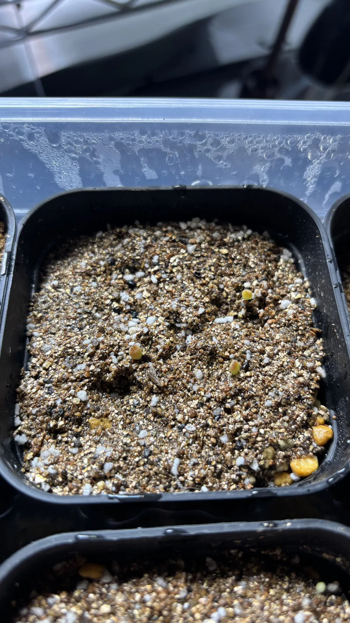 用土(表面は赤玉土極細粒,中底面は一般的な多肉用土)に種を蒔き、半透明の蓋をして腰水管理をしました。