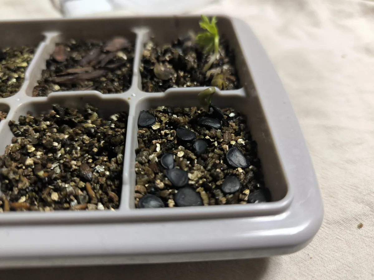 ダイソーの製氷皿にバーミキュライトを敷いて播種(覆土、保湿カバー無し)。