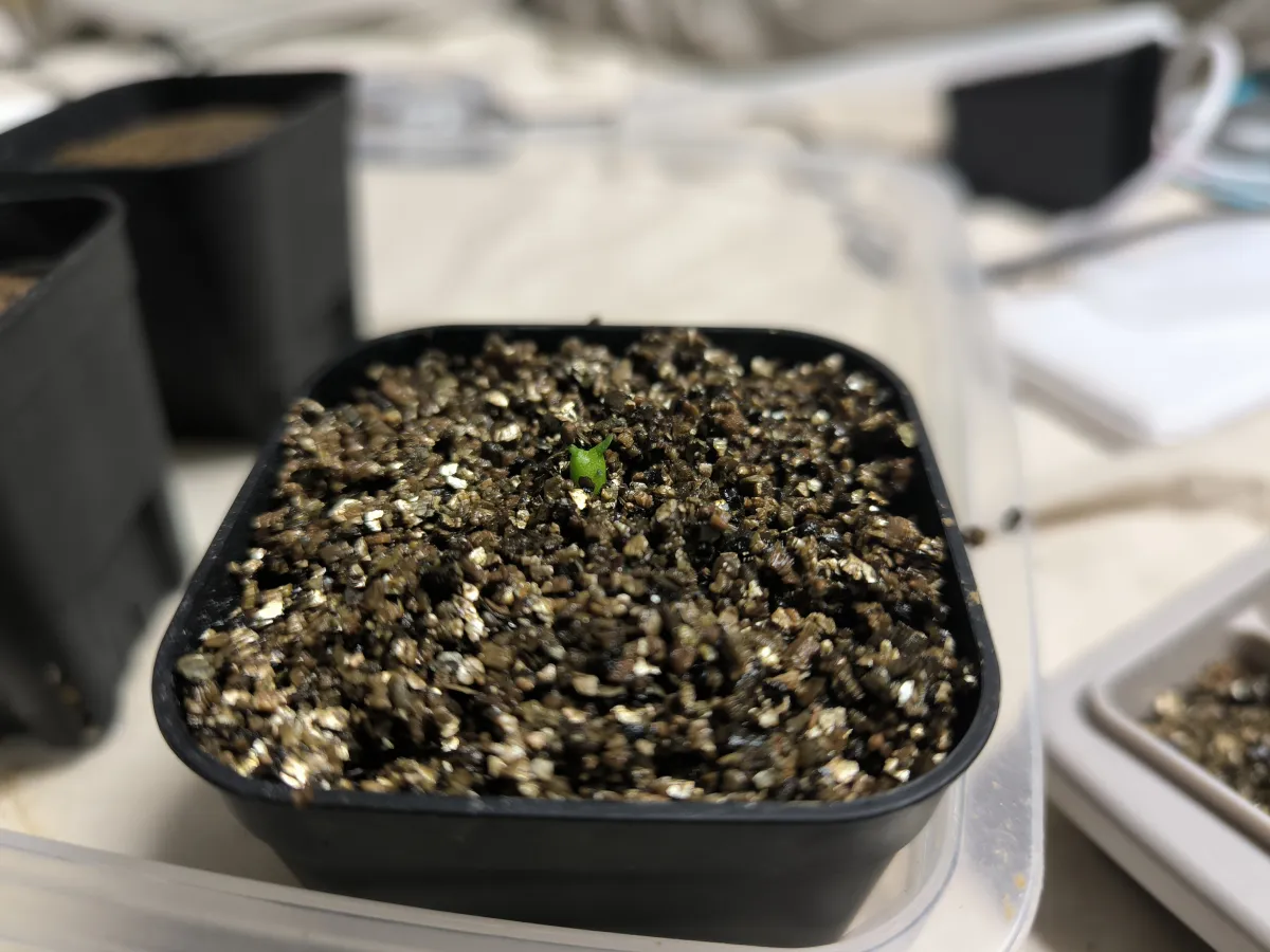 栽培スペースが手狭なため製氷皿で発芽管理し、発芽したら培養土入りの鉢に植え替えてます。(写真は植え替え後です)