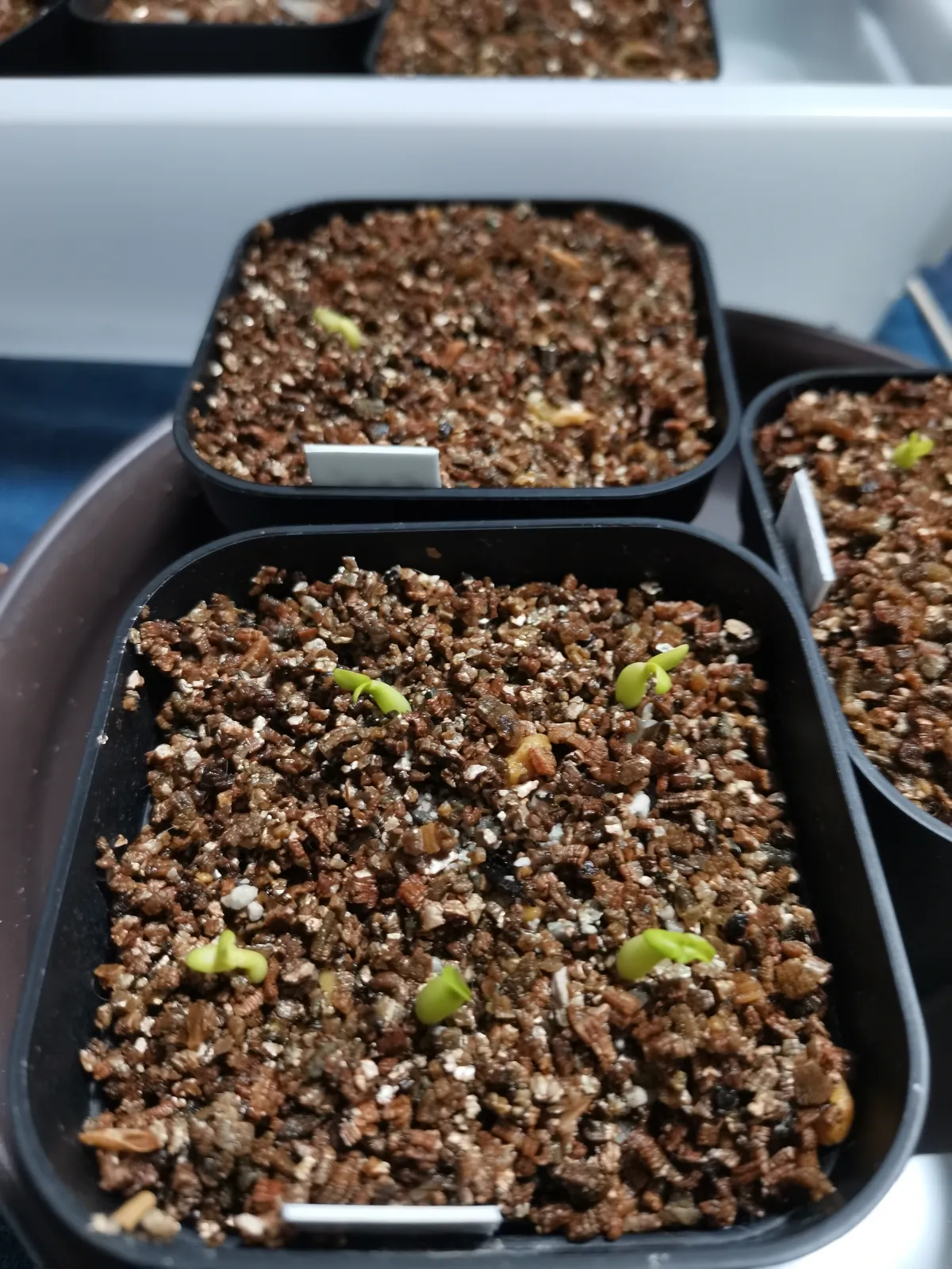 その後、蓋つきプラ容器にキッチンペーパーを敷いてメネデール・ベンレート溶液で湿らせた所に種を置き、動きのあった種から用土に移動、ベンレート・メネデール溶液の腰水・霧吹きで管理中。