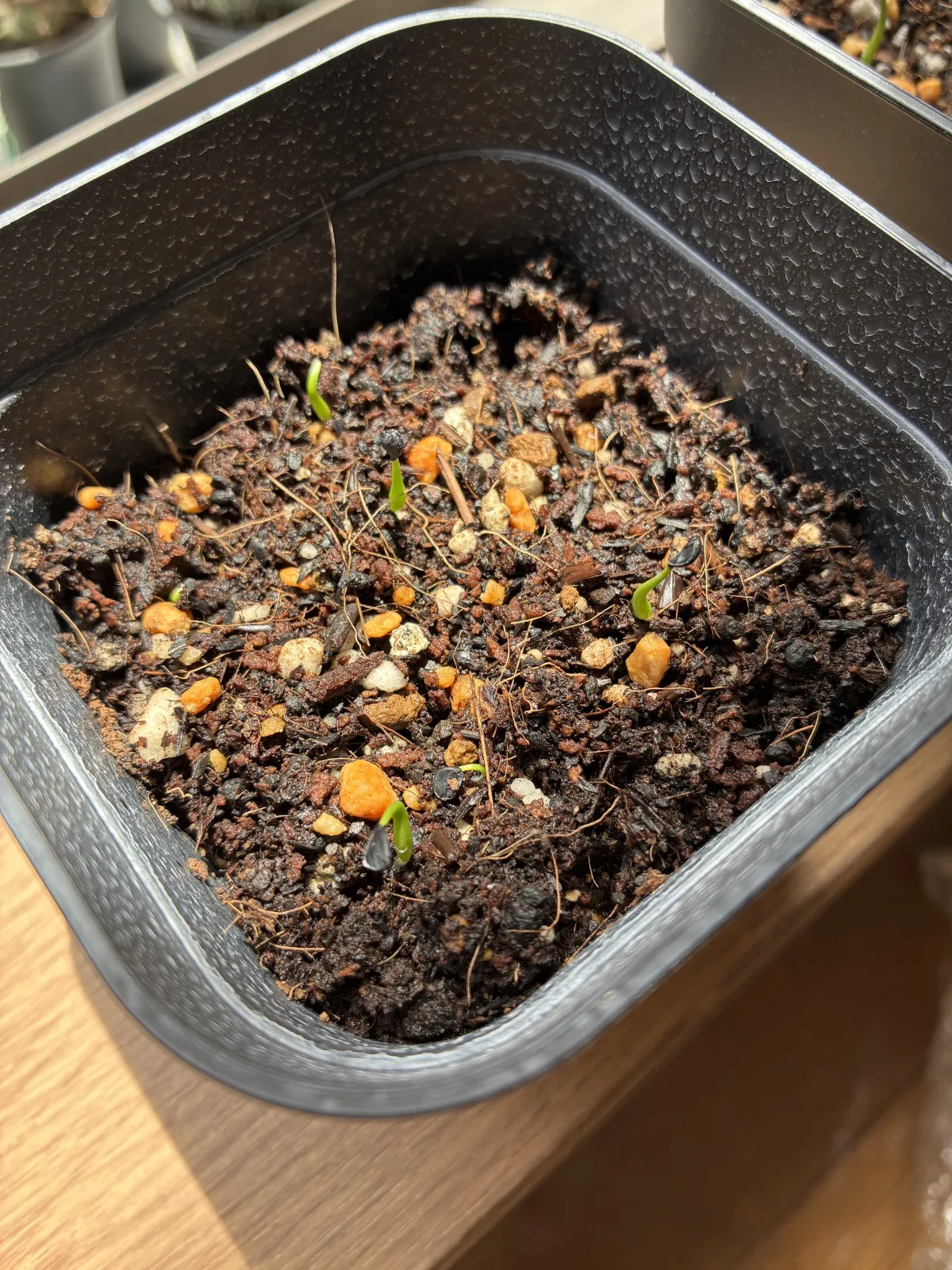市販の多肉植物用の土(鹿沼土、パーライト、赤玉土)の上に種まき用の土を少し