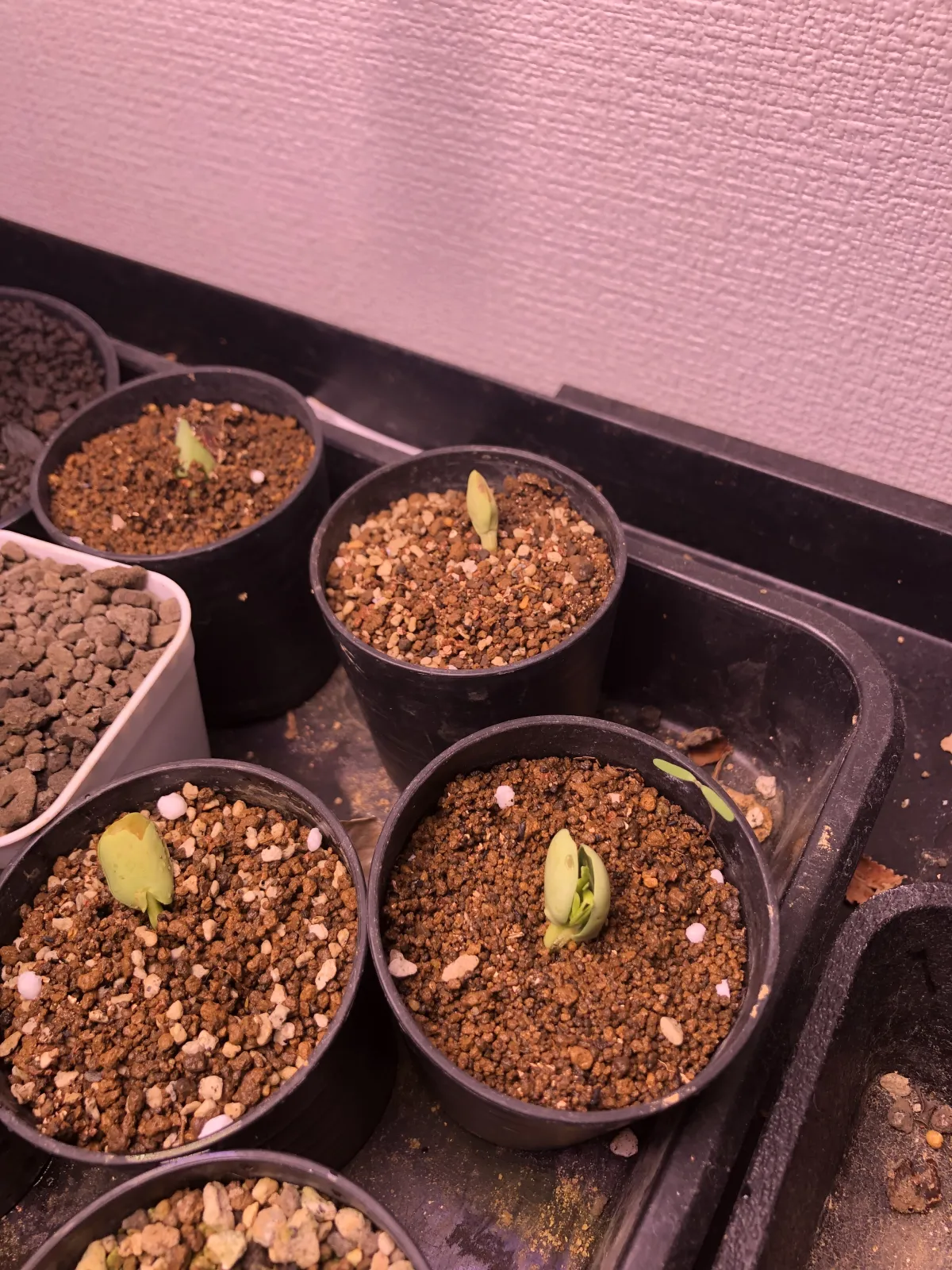 胚を傷つけつけないように殻の反対側を傷つけて中身を露出させ、ベンレートとメネデールを入れた水に24時間浸水。赤玉細粒を入れた鉢(腰水)に種を置いてラップで保湿し室内保管。