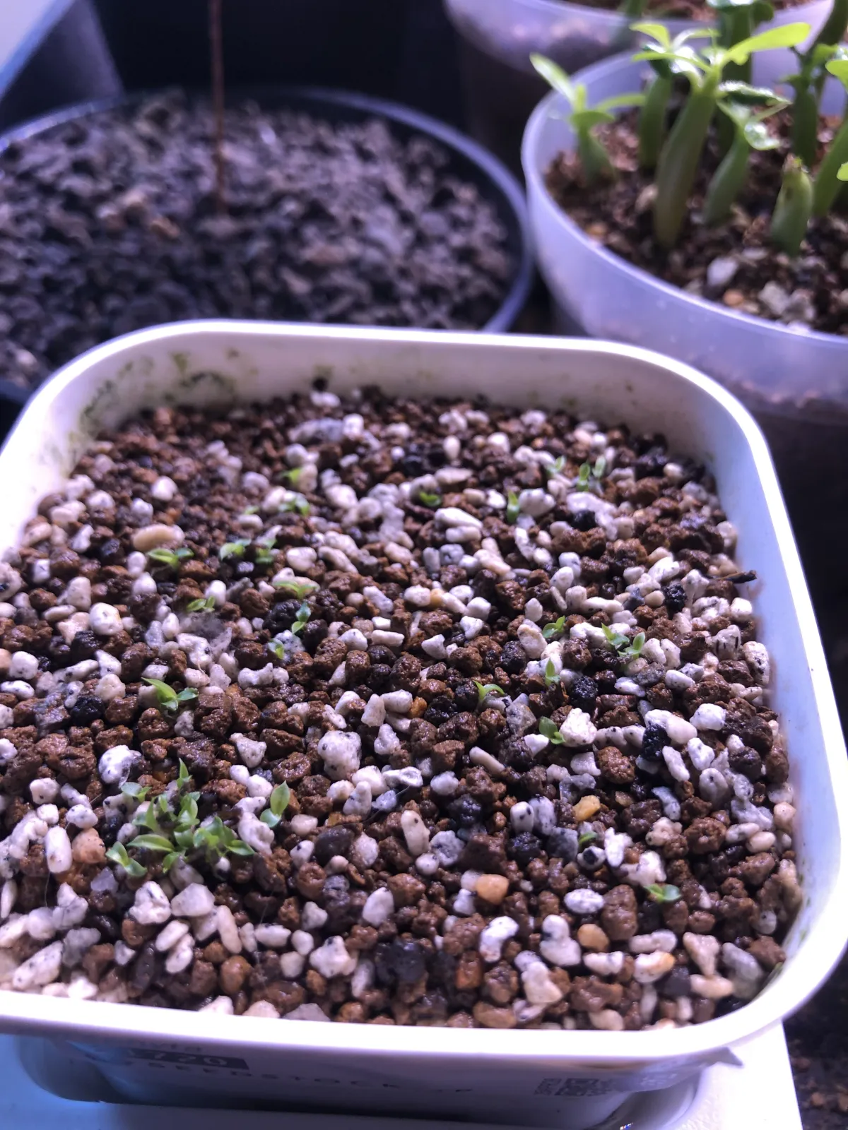 ベンレートとメネデールを入れた水に2時間浸水。赤玉細粒を入れた鉢(腰水)に種を置いてラップで保湿し室内保管。