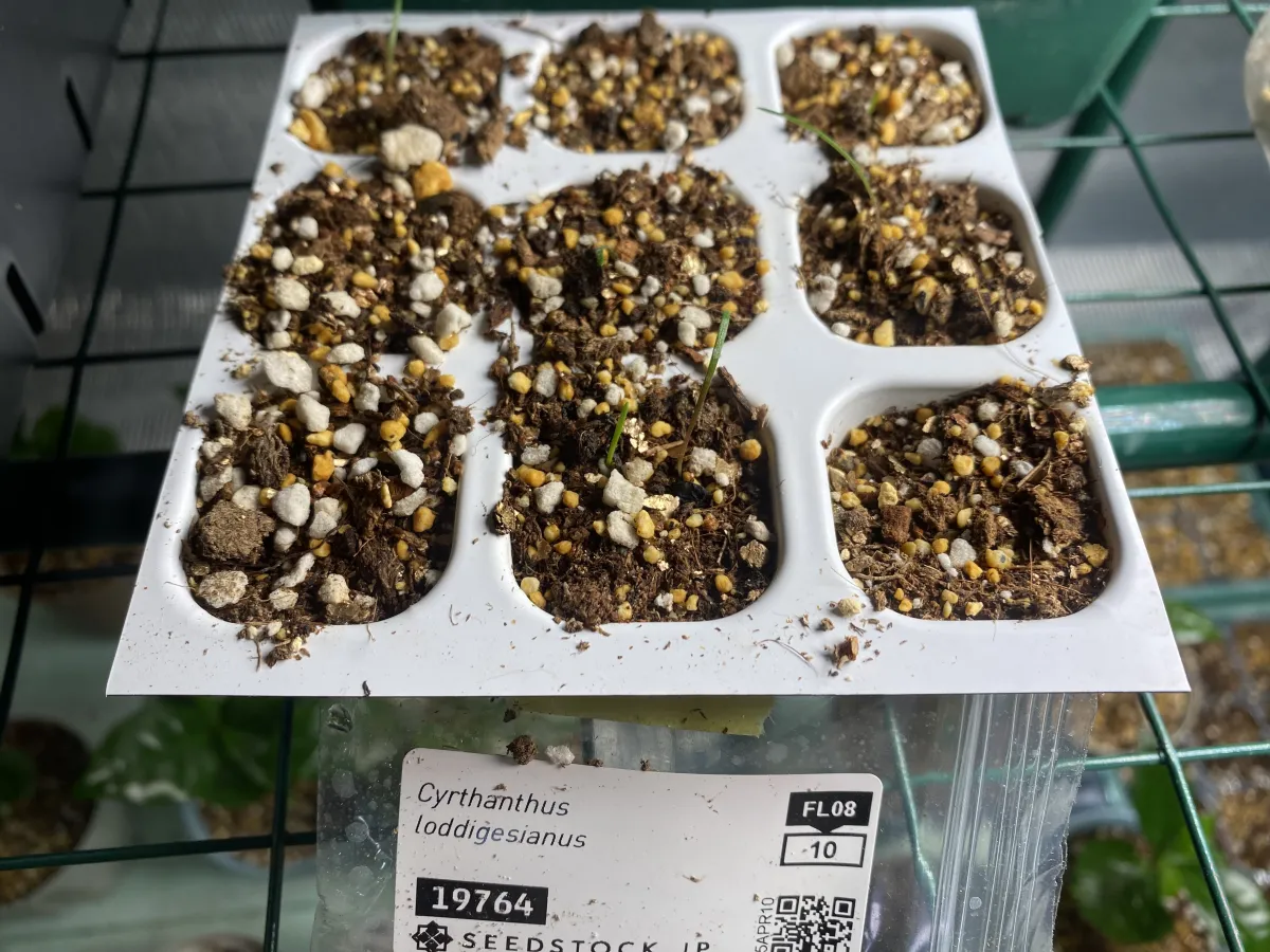 鹿沼土、ピートモス、パーライトを敷き播種、20度〜25度で管理