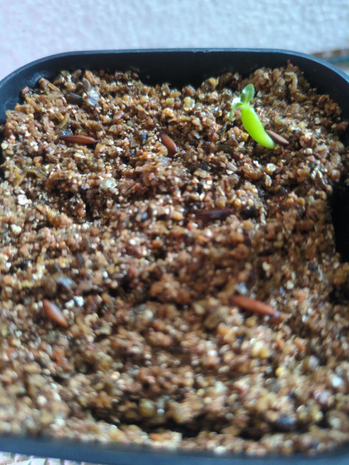 播種前にダコニール+メネデール溶液に12時間程度浸漬 赤玉メインの用土にバーミキュライトを敷き播種
