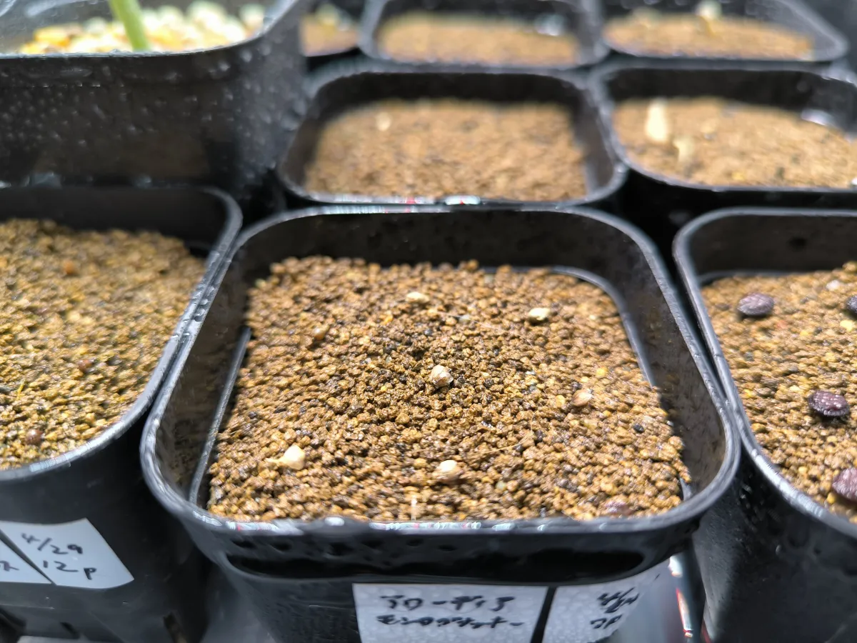 プレステラに培養土(軽石、赤玉、鹿沼)を2/3程入れ、残り1/3に芝の目土(赤玉細粒の代わり)を入れた上に播種。