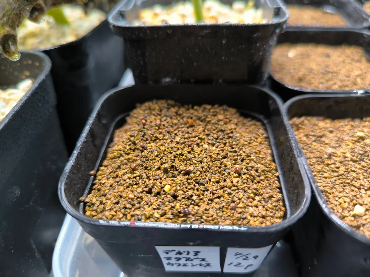 プレステラに培養土(軽石、赤玉、鹿沼)を2/3程入れ、残り1/3に芝の目土(赤玉細粒の代わり)を入れた上に播種。