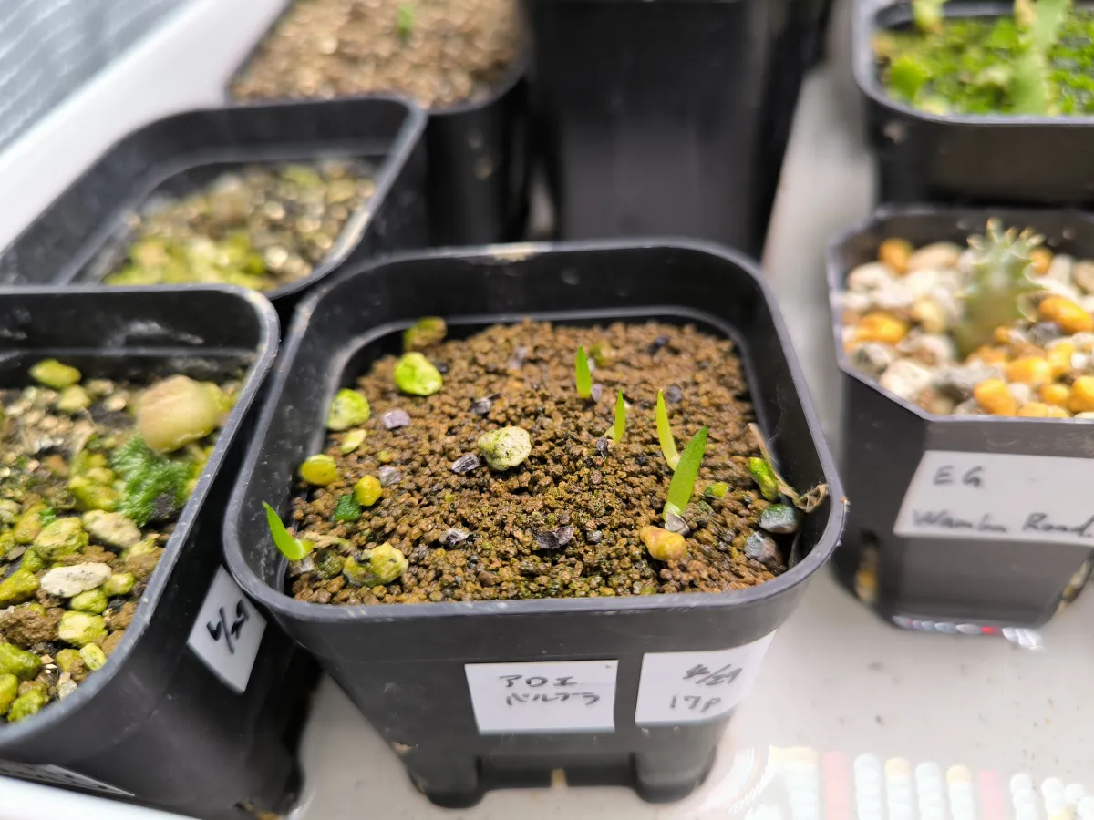 プレステラに培養土(軽石、赤玉、鹿沼)を2/3程入れ、残り1/3に芝の目土(赤玉細粒の代わり)を入れた上に播種。