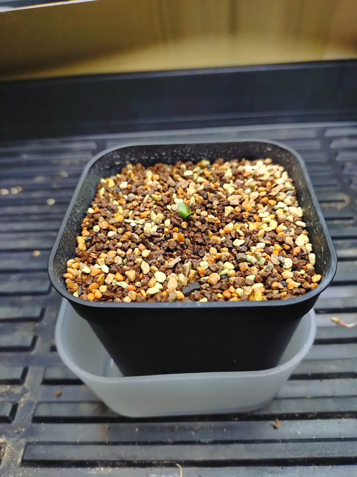 用土は盆栽用の細粒を熱湯消毒して使用。覆土はしない。