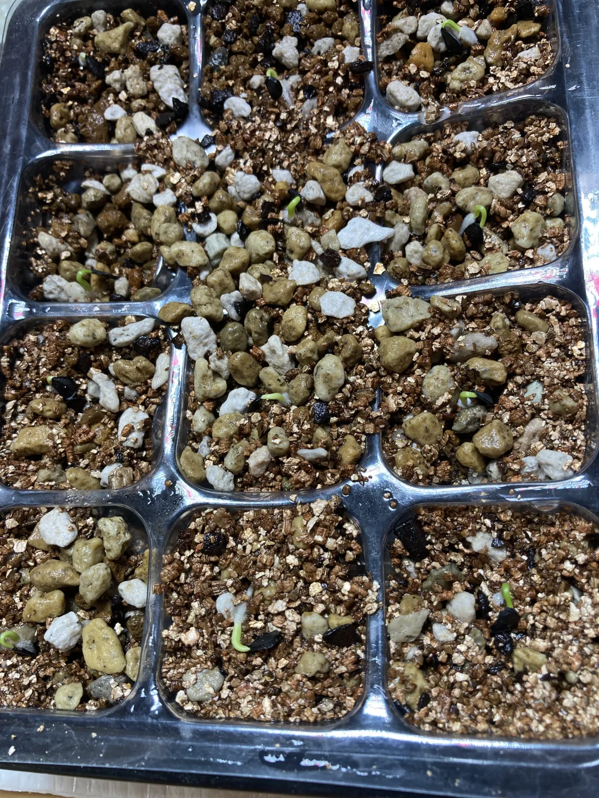 赤玉、日向土を同じ割合で混ぜた土にバーミキュライトを敷き播種、蓋をして15〜27度で管理