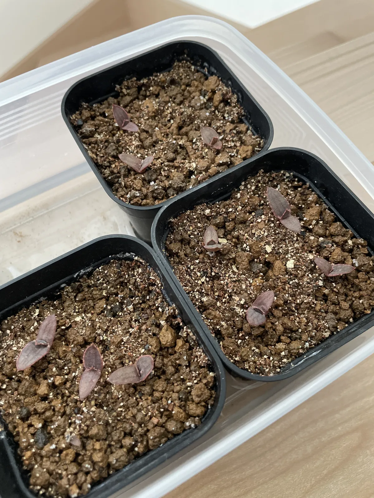 赤玉メインの用土にバーミキュライトを敷き播種。室内20度、窓際で管理。7日程度で発芽。