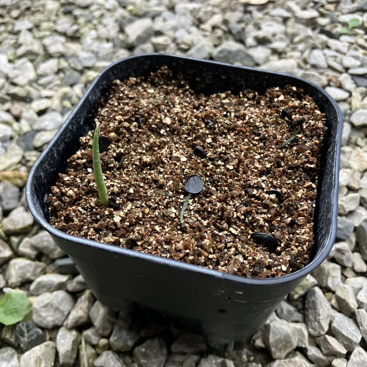 下から鹿沼、赤玉細粒、バーミキュライト上で播種、直射日光が当たらない場所での外管理