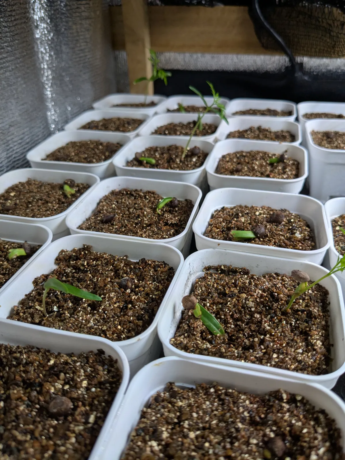 赤玉メインの用土に細めのバーミキュライトを敷き播種 ※一部ネコチップをしいたがなくてよかったかも
